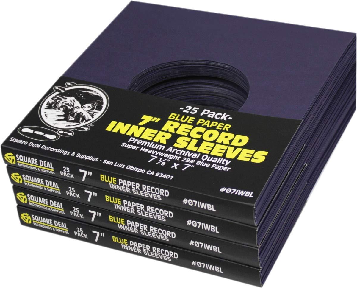 These are 45rpm blue paper inner sleeves with a hole. The inner sleeves measure 7-1/8" x 7" (or 181mm x 178mm). The sleeves feature a 1/4" lip between the front and the back for easy machine insertion. The sleeves have square corners and are made from heavy-weight paper (29#). These sleeves are archival quality: acid free, and alkaline free! Replace your worn out or torn inner sleeves and freshen up your collection. These are what we use in our own retail store! (These go over the naked vinyl record and slide into a jacket or outer sleeve.)