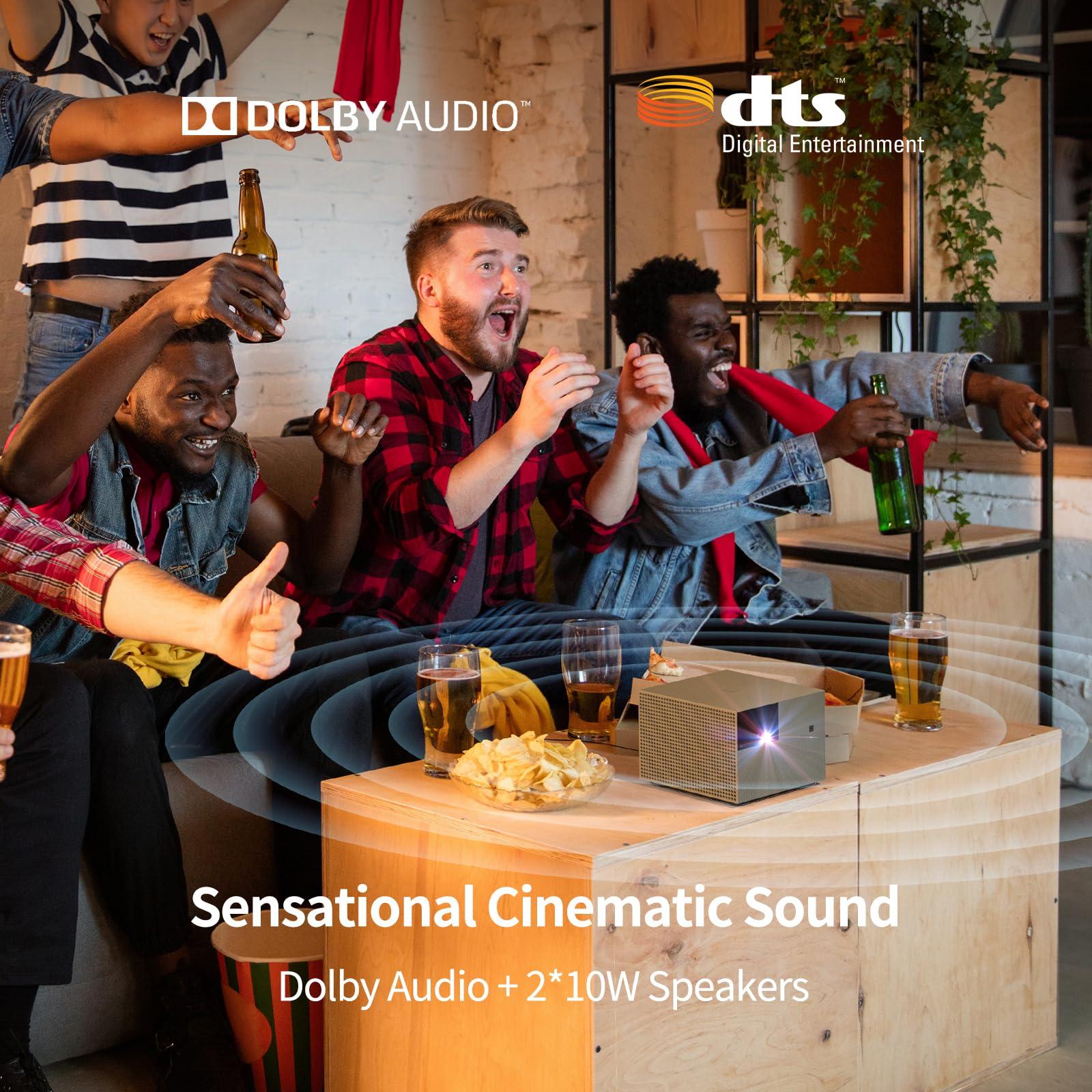 - Cinematic Surround Sound and Projection SizeTransform your living room into a cinematic theater with dual 10W built-in Dolby Audio & DTS-HD speakers. Enjoy a dynamic range of sound while projecting images from 40" to 200". Ideal for hosting movie nights, playing video games, or creating an immersive presentation environment.