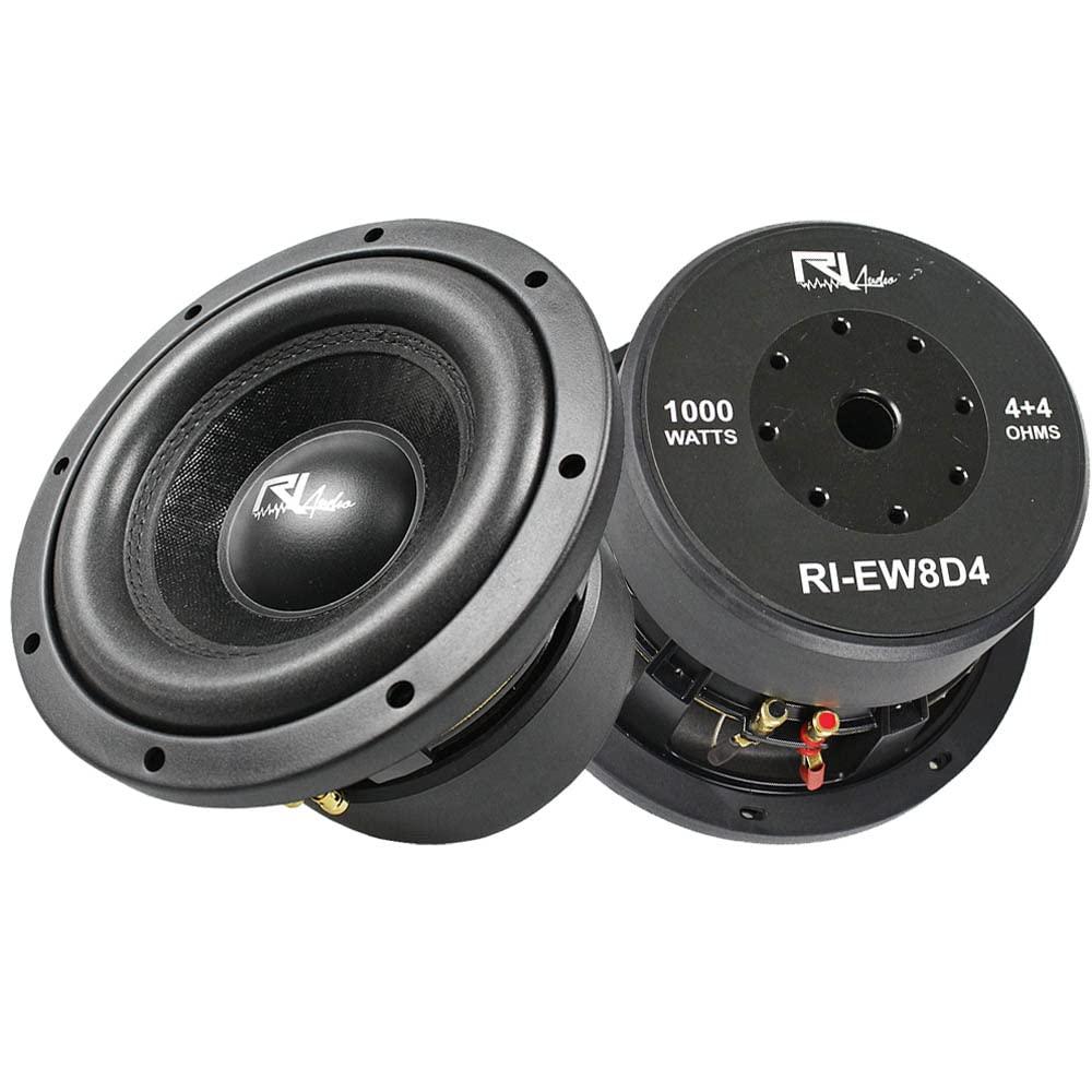 RI Audio 8" Subwoofers Dual 4 Ohm Energy Series RI-EW8D4 2 Pack Harness the performance of the new Energy Series Subwoofers from RI Audio. With ultimate production and value in mind, the creation of the power series was born. These 8" Subwoofers have an incredible true 500 Watt RMS power handling. Featuring an accordion-style surround, traditional push-in-style terminals, and durable stamped steel construction, these subwoofers will give you the deeper bass and sound quality you deserve for any system you build. Specifications Hybrid spider with interlaced tinsel leads Traditional push-in style terminals Stamped steel basket Non pressed paper cone Nominal Diameter: 6.5" 4+4 Ohm impedance Program power: 500 Watts RMS Peak power handling: 1000 Watts Max Frequency Response: 20-500Hz Sensitivity: 85 Db Spl Voice coil diameter: 50.80mm (2") Coil material: CU Former Material: ASV Mounting Depth: 4 7/8" Overall Mounting Depth: 5 1/2" Mounting Diameter: 7 1/2" Overall Diameter: 8 11/16" Magnet Diameter: 6 1/4" *This listing is for Two RI Audio Subwoofers*