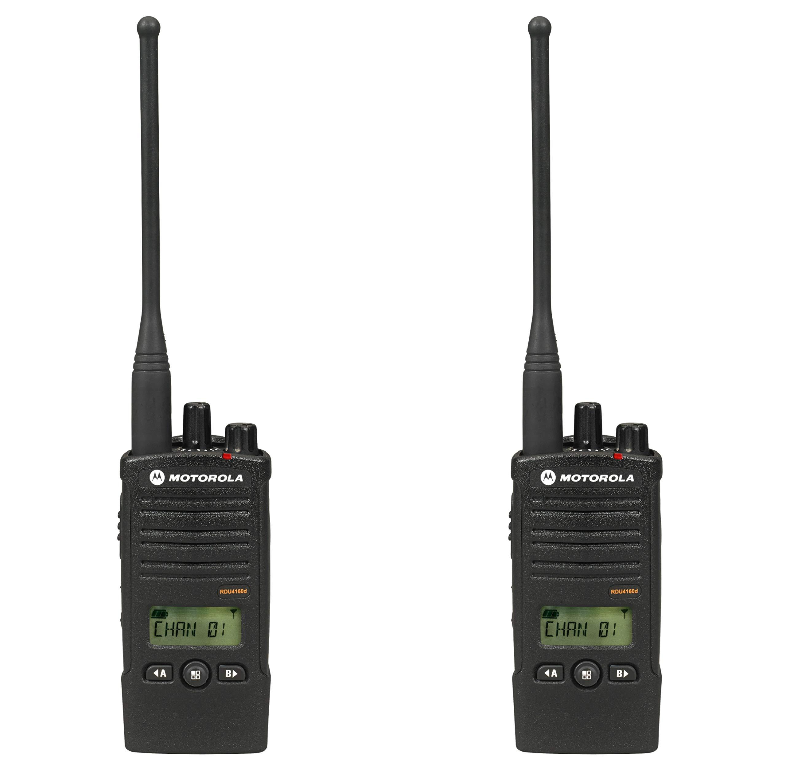 - 2-Pack includes: 2-Motorola RDU4160d Two-Way Radios, 2-2400 mAh Li-ion Rechargeable Battery, 2-Spring Loaded Belt Clips, 2-10 Hour Plug-in Chargers, 2-Antennas, 2-User's Guide
