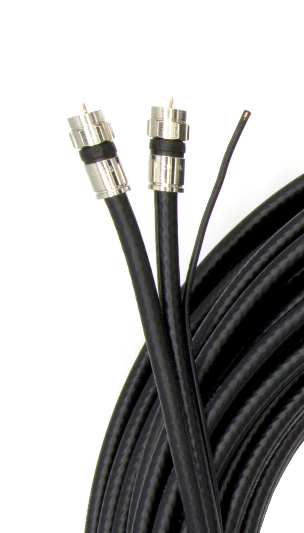 This cable is available in Black and White, and comes in lengths from 1 foot to 200 feet (including our most popular lengths of 50 feet, 75 feet, 100 feet, 150 feet, and 200 feet). The center conductor is made of high grade copper coated steel that has been swept to 4.0GHz, making this a great application for Satellite, Cable, Wireless (including cell services), and Communication uses. With very low signal attenuation (2.75dB at 750MHz for our 50' cable) it can be used on long runs without the loss of signal or picture. We use high grade 360 degree compression connectors to ensure that this cable remains water and weather proof, without the loss of any signal. This ensures that the ends can withstand pulling, weather, extreme hot and cold (rated up to 167 degrees F). The coaxial shielding is 60% aluminum magnesium alloy braid and 100% solid aluminum foil (including an 18% overlap) to ensure that there is no interference from neighboring or rouge signals. The outer jacket is a flexible UV resistant PVC and has been tested to be used in many extreme conditions for use both inside and outside. The dielectric center is made from gas injected foam PE and has an almost perfect consistency of 75 Ohms +/-3 throughout the entire length of the coax cable. The outside diameter of the cable is 0.27 inches, about 6.85 mm, with the connectors being slightly larger at .4375 (7/16) of an inch (11.11 mm).