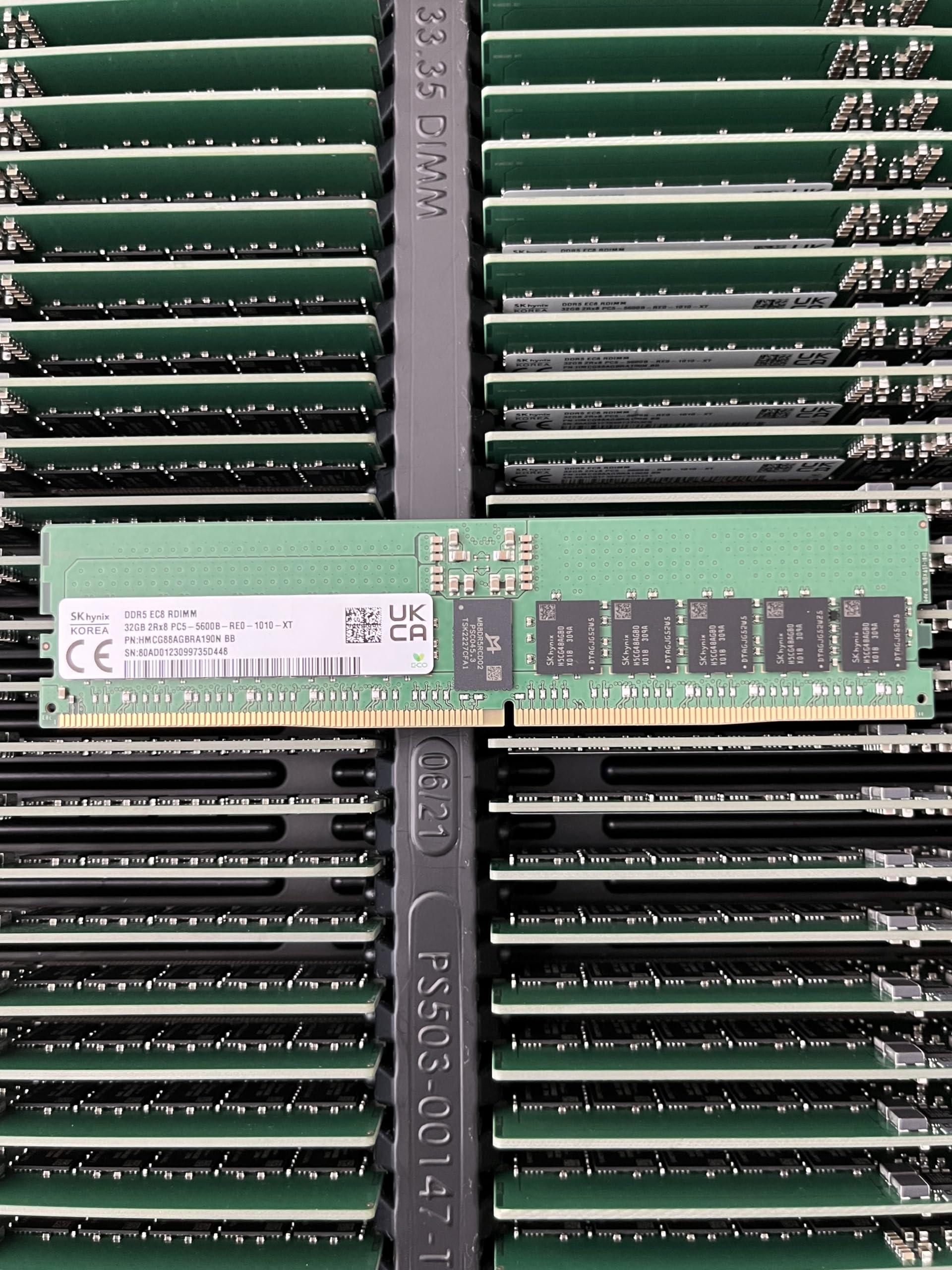 32GB DDR5 PC5-5600 RDIMM 288-pin ECC Reg RAM 5600B 4800R *32GB *DDR5-5600B (4800R) *CAS Latency 46 *288-pin *Registered *1.1V *ECC CAS Latency: CL46 Form Factor: DDR5 Memory Type: ECC Memory Voltage: 1.1v Registered: Yes Pins: 288 Pin 2RX8 Speed: 5600MHz (PC5-44800) HMCG88AGBRA190N BB