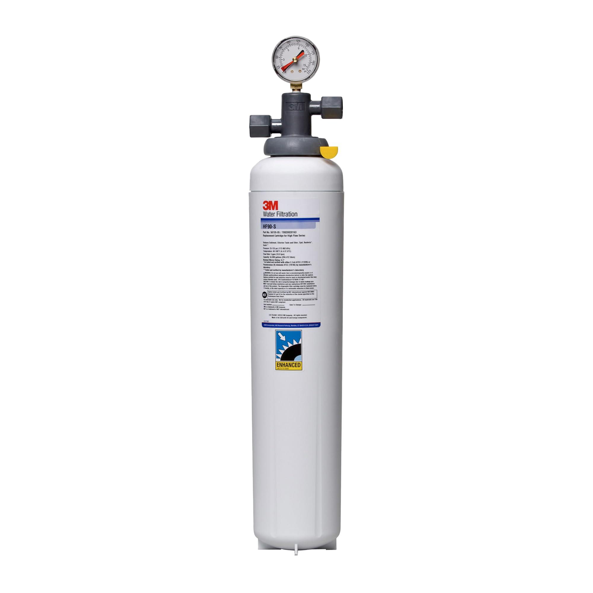 3M Water Filtration Systems help provide consistent high quality water for commercial ice maker machines within restaurants, cafs, quick service restaurants, coffee shops, convenience stores, and other foodservice outlets. 3M High Flow Series System ICE190-S helps reduce the effects of particulate, chlorine taste and odor, cysts, and scale at flow rates up to 5 gpm. Built-in scale inhibition reduces the ability of calcium and magnesium to precipitate on the evaporator plates as hard scale. Revolutionary Integrated Membrane Pre-Activated Carbon Technology (I.M.P.A.C.T.) dual-zone media cartridge construction combines a membrane in series with premium activated carbon to provide superior throughput and cartridge life. System includes a head assembly with pressure gauge, inlet water shut-off valve assembly, mounting bracket and a single cartridge filter. Replacement filter is the 3M High Flow Series Replacement Cartridge HF90-S. 1/2 FNPT horizontal inlet and outlet ports allow direct or easily adaptable connections to existing plumbing lines. Filter Specs: 5 gpm flow rate and 54,000 gallon capacity. Sizing: low flow cubers to 1,450 lbs., high flow cubers to 1,000 lbs., and flakers to 2,400 lbs. Based on testing using Cryptosporidium parvum oocysts. As tested by manufacturer.