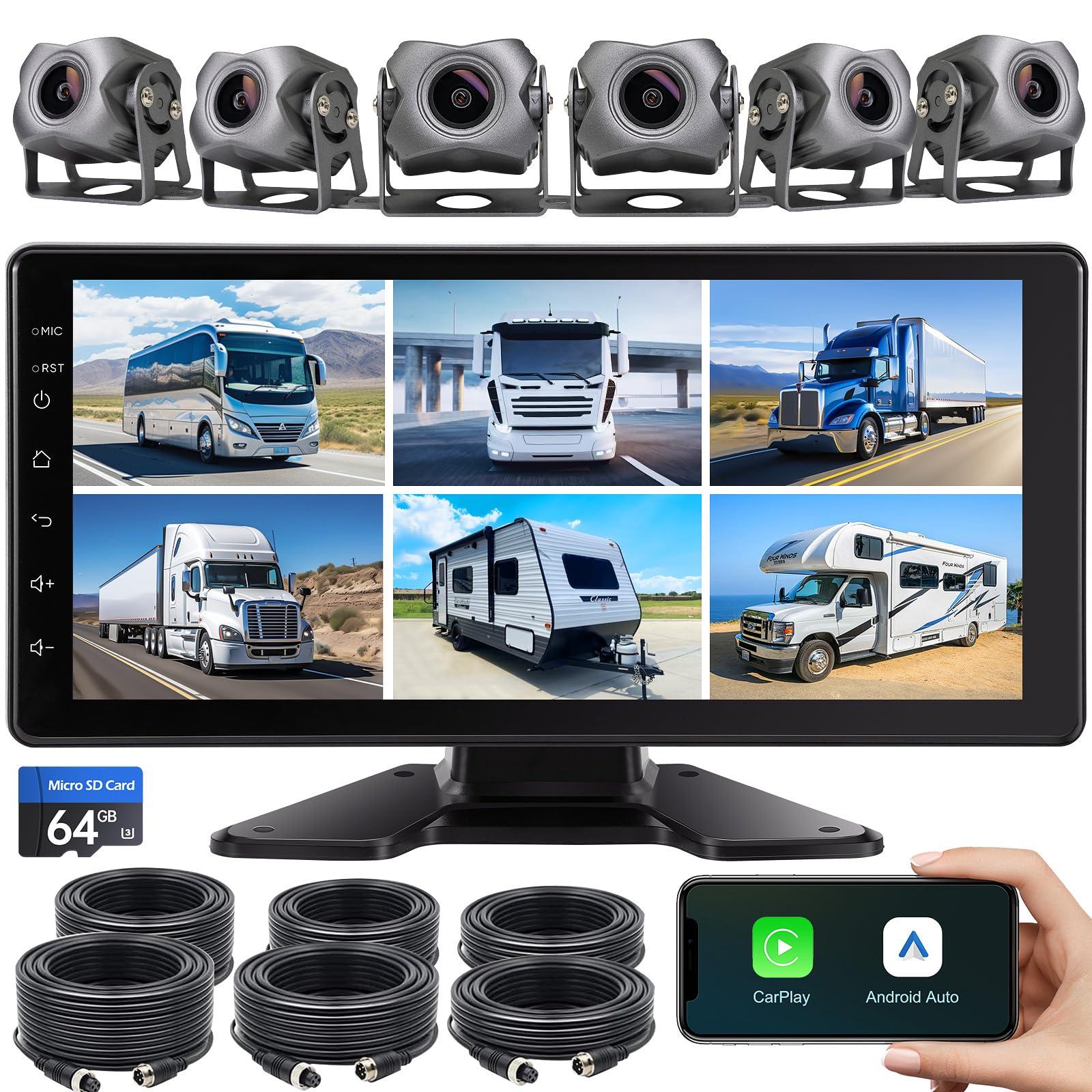 - 6-Channel Dash Cam with 10.33 Inch Touch Screen: With 10.33-inch HD IPS touch screen is far superior to the market, delicate and simple, can clearly displaying real-time 1080P video, built-in DVR recording function, can achieve multi-view monitoring on the screen, support local playback and loop recording, you can easily find the video in the display.