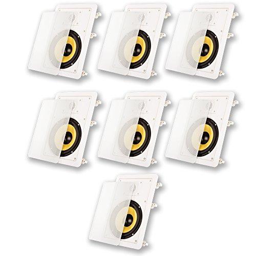 Product Description Acoustic Audio by Goldwood HD-650 Flush Mount In Wall 7 Speaker SetCenter Channel with Front, Middle and Rear, Right and Left home theater configurationWide Sound Dispersion Designed Speakers easily integrate with new and existing audio systemsTraditional Passive speaker design, simply drive power from your home audio receiver or ampFlush Mount low profile housings install easy with unique Pressure Lock Mounting SystemFull Range sound coverage with 2-way woofer and tweeter configuration6.5" Woven Fiber bulletproof cone woofers with butyl rubber surroundsPivoting Titanium tweetersFrequency response is 30Hz-22 kHz with 98dB at 8ohmPressure Lock Mounting System clamps tight to drywall with No Hardware NeededFits rectangular speaker hole size of 7.375" x 10.75" with a mounting depth of 3"Overall speaker size of 8.875" x 12.25" with Spring Loaded raw wire connectionsDurable ABS Housings and Removeable Grills can be painted to match your dcorSystem RequirementsAny home audio receiver or amplifier with raw speaker wire outputsYour receiver power should be no less than 10 and no more than 300 watts per channelCL3 Rated in wall certified raw speaker wire to connect your receiver to the speakersApplicationsHome Theater Surround Sound SystemsWhole House Audio SystemsBusiness or Retail InstallationsWhat's in the box7 Flush Mount Passive Speakers with Removeable GrillsCut-Out TemplatesInstruction Manual