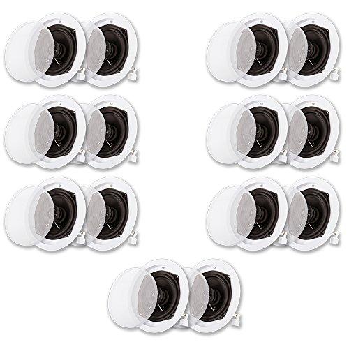 Product Description Acoustic Audio by Goldwood R191 Flush Mount In Ceiling 14 Speaker SetWide Sound Dispersion Designed Speakers easily integrate with new and existing audio systemsTraditional Passive speaker design, simply drive power from your home audio receiver or ampFlush Mount low profile housings install easy with unique Pressure Lock Mounting SystemFull Range sound coverage with 2-way woofer and tweeter configuration5.25" High Rigidity Polypropylene cone woofers with butyl rubber surrounds12mm Soft Dome tweetersFrequency response is 45Hz-22 kHz with 95dB at 8ohmPressure Lock Mounting System clamps tight to drywall with No Hardware NeededFits round speaker hole size of 6.625" with a mounting depth of 3"Overall speaker size of 7.625" with raw wire clamp or solder connectionsDurable ABS Housings and Removeable Grills can be painted to match your dcorSystem RequirementsAny home audio receiver or amplifier with raw speaker wire outputsYour receiver power should be no less than 10 and no more than 200 watts per channelCL3 Rated in wall certified raw speaker wire to connect your receiver to the speakersApplicationsHome Theater Surround Sound SystemsWhole House Audio SystemsBusiness or Retail InstallationsWhat's in the boxes14 Flush Mount Passive Speakers with Removeable GrillsCut-Out TemplatesInstruction Manual