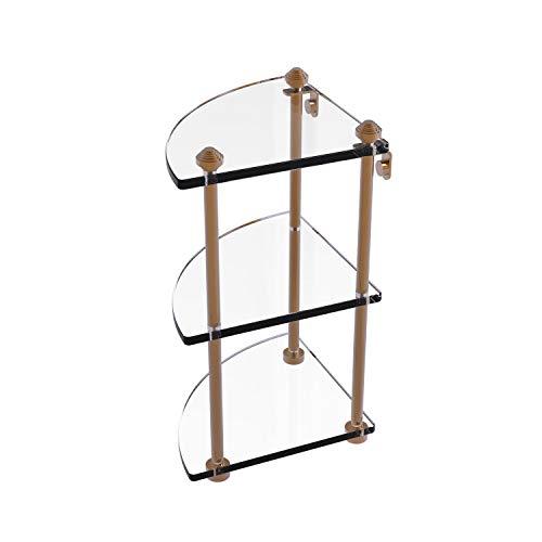 Add space and organization to your bathroom with this simple, contemporary design 3-tier glass vanity corner shelf. Featuring tempered, beveled-edged glass and solid brass hardware this shelving unit is crafted for durability, strength and style. One of the many coordinating accessories in the Allied Brass collection of products, this subtle glass shelf unit is the perfect complement to your bathroom decor.