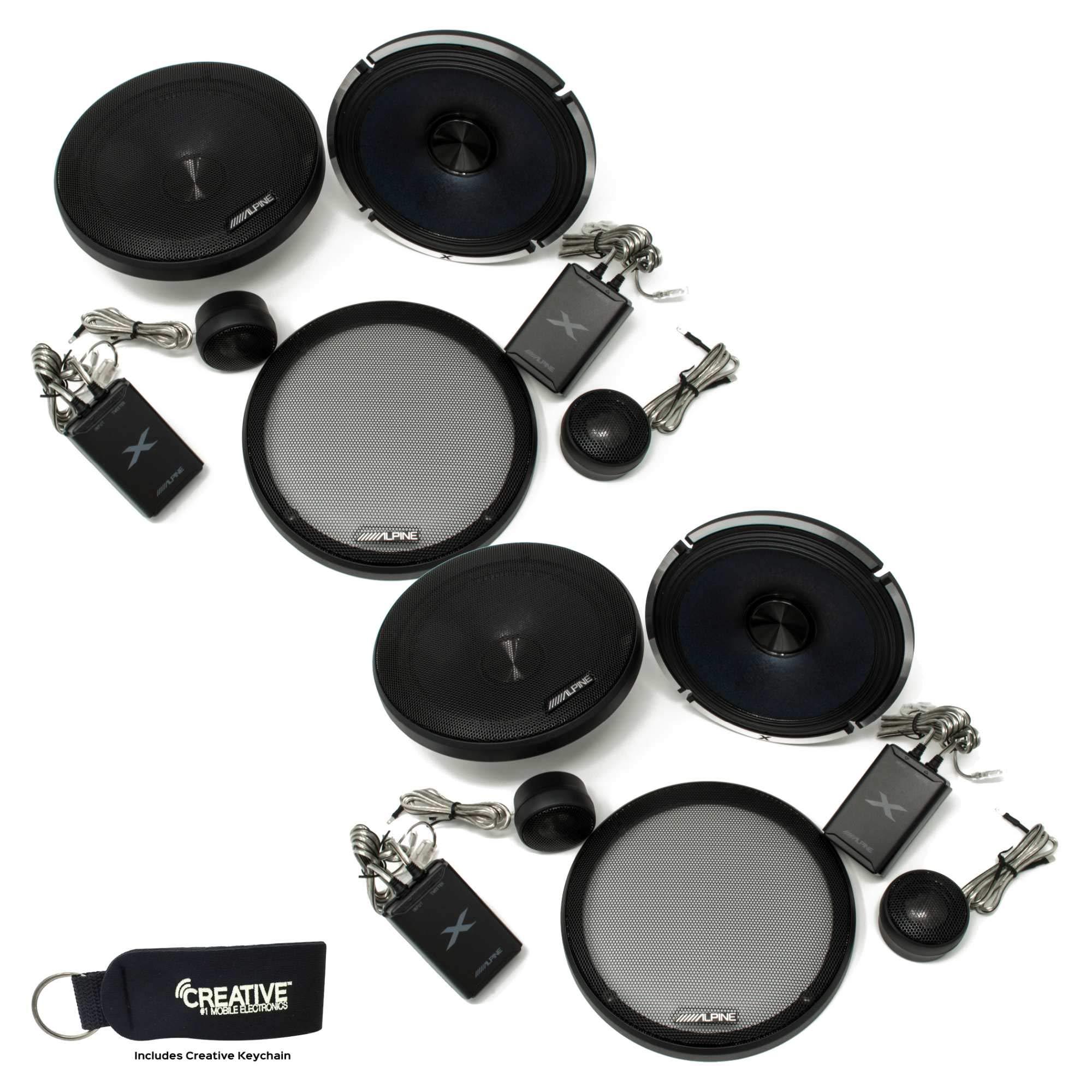 This bundle contains two pairs of Alpine X-S65C X-Series 6.5" Component 2-Way Speaker Sets Alpine X-S65C X-Series 6.5 Inch Component 2-Way Speakers CTA-2031 Specifications: 120W RMS, 360W Peak, 4 Ohm SPECIFICATIONS Woofer: 6-1/2" cone Tweeter: 1" Carbon Graphite Maximum Peak Power: 360 Watts Maximum RMS Power: 120 Watts lmpedance: 4 ohms Sensitivity: 89 dB SPL (1W @ 1m) Frequency Response: 55 Hz to 50 kHz Mounting Depth/Drop-in Mounting: 2-5/16- (5.9cm) Cutout Diameter: 5-13/32- (13.7cm) circle Recommended Amplification: up to 120 watts RMS per channel Warning: This product contains a high performance tweeter. If there is a tweeter already installed in your car, then you must disconnect its terminals. If you leave the original tweeter connected and connect this product in parallel, then a fault may develop in this product, so you are strongly recommended not to do so. New radial neodymium motor structure: A pole-type neodymium magnet positioned inside the voice coil (as opposed to outside) creates an improved magnetic circuit with less loss for more efficient power delivery. Since the magnet is smaller than conventional designs, it allows the depth of the X-Series speakers to be much shallower and thereby compatible with more vehicles. New nanofiber cone: The small-diameter nanofibers create a cone structure that is lightweight and rigid, for increased sound accuracy. Nanofiber cones also have good internal damping, so residual energy decays quickly without distorting the original music tones. New carbon graphite tweeter: Alpine chose carbon graphite for the tweeter because it is rigid enough to perform like a hard dome tweeter but maintains the natural sound characteristics of a soft dome tweeter. The tweeter delivers increased accuracy and extended high frequency range without the harshness that is sometimes associated with hard dome tweeters.