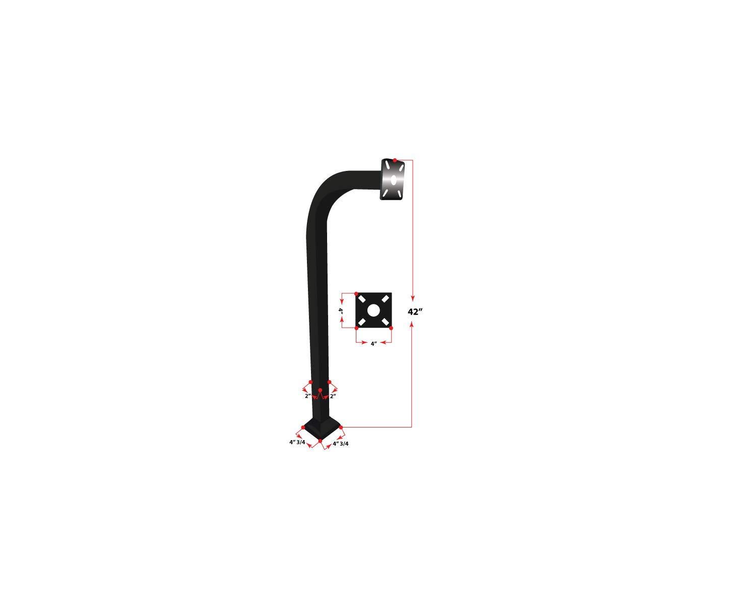 2" X 2" Heavy wall Aluminum 42" in Height. Top plate is 1/4" 4" X 4" as to fit most keypads. Available in 3 standard colors - Black, Bronze, White. Offset of 15" and universal top plate which will fit most keypad.