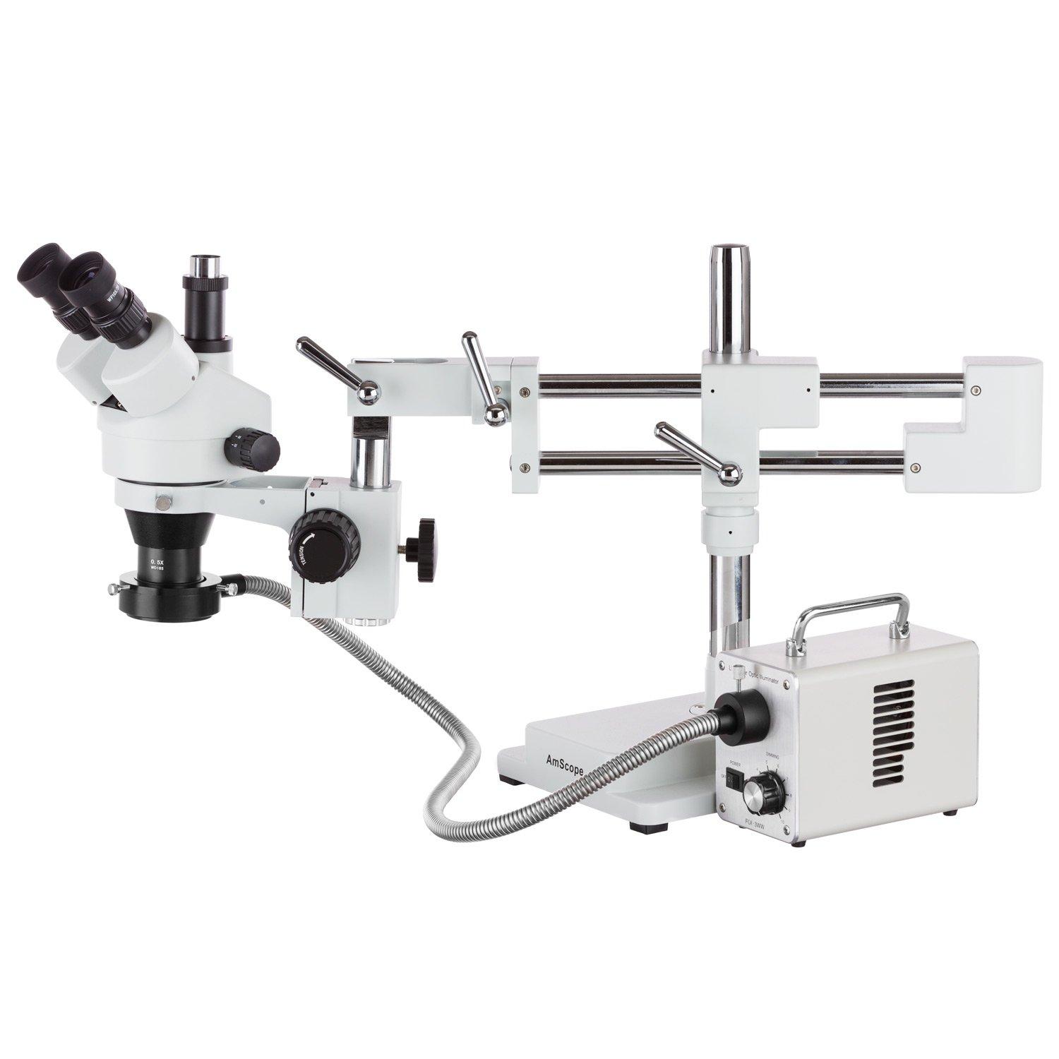 This stereo industrial inspection microscopy system includes a trinocular 3.5-90X zoom microscope head, a double-arm boom and a 30 Watt LED fiber-optic ring light illuminator. It is a perfect inspection viewing system offering sharp crystal clear images. With 30mm super widefield high-eyepoint eyepieces and super widefield reduction objective lenses, the microscope gives extremely large zoom magnification range (26:1) and large working distance (8"). The double-arm boom stand allows you to turn the microscope head around three different axes (x, y and z); that is, you can point the microscope head in any directions you wish. With the addition of the trinocular photo port, you can use a camera to view live images on a large or small-format monitor, as well as record the inspection process. The light source has a built-in heat filter for cool light . This LED light has radiator and cooling space which allows no cooling off time needed after use. This inspection microscopy system is great for both industrial and biological applications. It is an ideal instrument for research labs, gemologists, and anyone in semiconductor and electronic industries.
