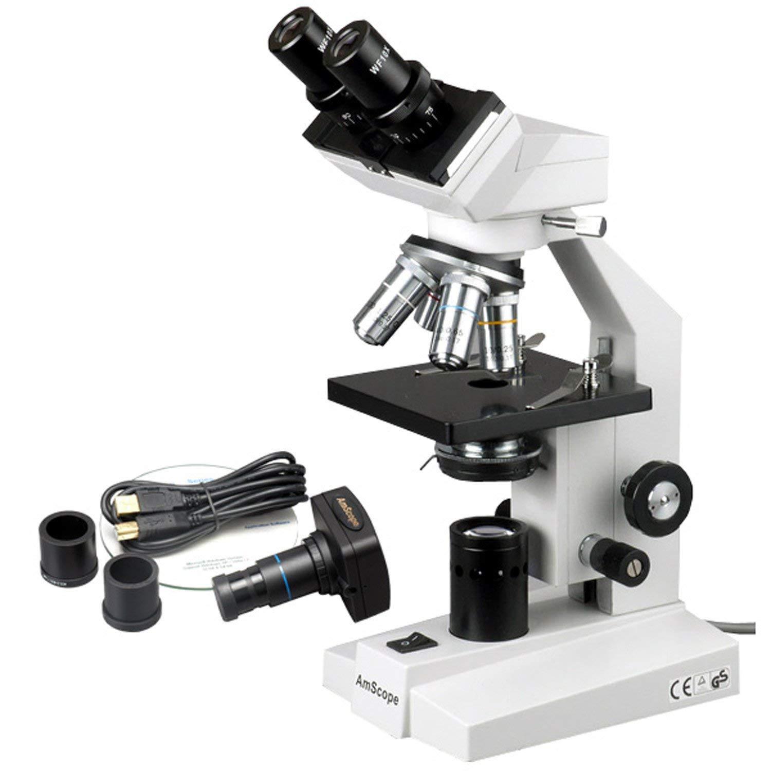 The AmScope B100-M digital compound binocular microscope has a 1.3MP camera, a pair of 10x widefield eyepieces, a forward-facing nosepiece with four DIN achromatic objectives, Brightfield (BF) illumination from a 20W tungsten bulb, a 1.25 NA Abbe condenser, and a fixed stage. The 1.3MP camera has a CMOS color sensor, a reduction lens, image capture and editing software, and USB 2.0 output to capture or display still or video images on a computer or projector. The binocular viewing head has a pair of 10x widefield eyepieces and sliding head to adjust inter-pupillary distance, a fixed 45-degree vertical inclination to reduce eye and neck strain, and a 360-degree rotation capability to provide a more comprehensive view and enable sharing. The sliding head has an adjustable inter-pupillary distance of 55 to 75mm. The forward-facing nosepiece has 4x, 10x, 40xR, and 100xR (oil) DIN achromatic objectives that provide color correction of magnified images. The 40xR and 100xR objectives are spring loaded to prevent slide damage when focusing. The 100xR oil objective provides increased resolution over a standard objective. A digital compound microscope is used for inspection and dissection of specimens when two-dimensional images are desired, and where image capture, detailed records, or documentation is required.