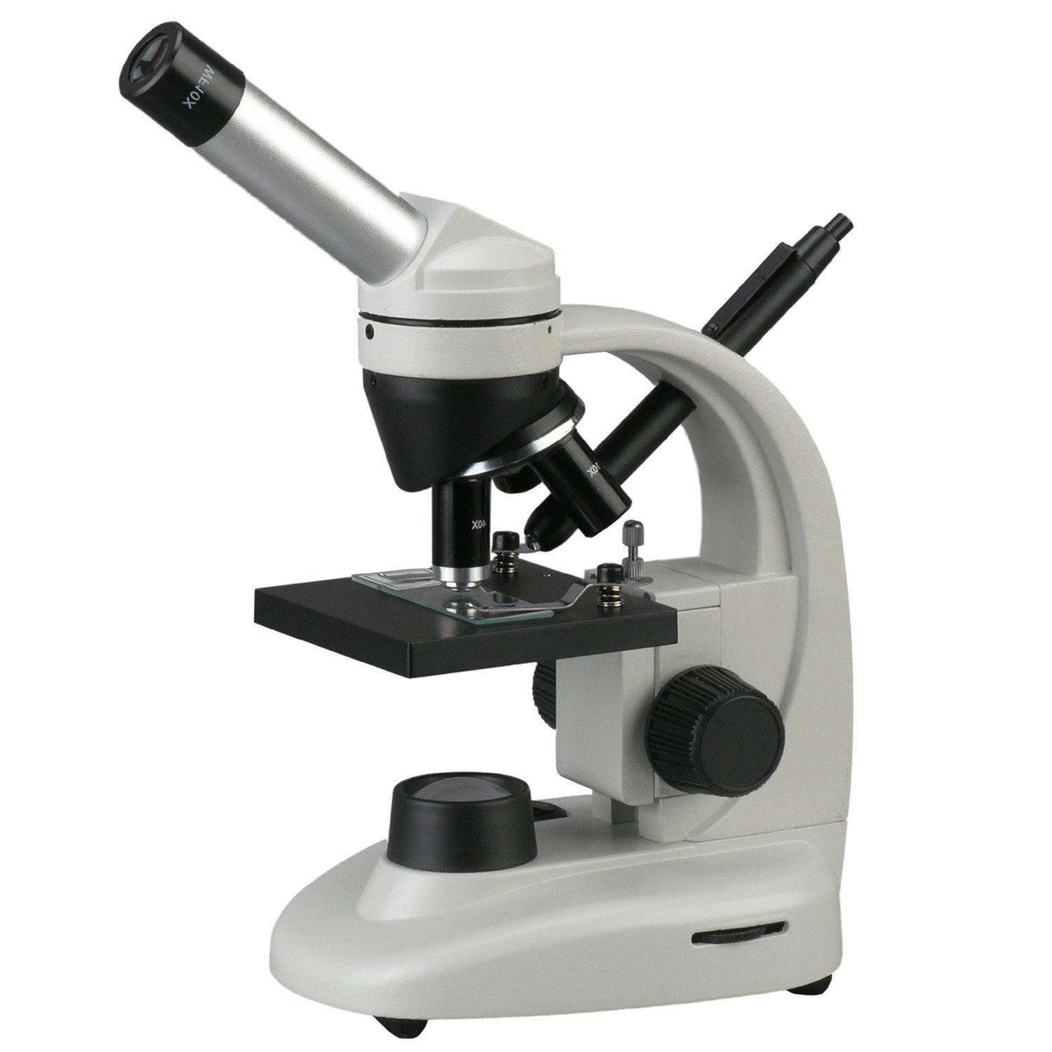 The microscope has upper (episcopic) LED illumination that reflects light off the specimen for enhanced visibility of opaque specimens, and lower (diascopic) LED illumination that transmits light up through the specimen for enhanced visibility of translucent and transparent objects. Brightfield (BF) illumination allows the specimen to absorb light, resulting in a dark image on a light background. LED illumination provides bright, cool light for working with temperature-sensitive or live specimens. The 0.65 NA single-lens condenser and disc diaphragm control the amount of light illuminating the specimen. The plain stage has an opening for light transmission and stage clips to secure the slide or specimen in place while viewing. A stage stop prevents the stage or specimen from coming into contact with the objectives. The microscope has two AA rechargeable batteries and a power adapter to allow use away from power sources. The solid-metal frame has a stain-resistant enamel finish for durability. The microscope comes with five blank slides and five prepared slides. SpecificationsHeadCompound monocularEyepiecesWF10x, WF25xObjectives4X, 10x, 40x achromaticStagePlainLighting configurationTransmitted (lower)CondenserSingle lensDiaphragmDisc diaphragmLight sourceTungsten (incandescent), 6WIllumination typeBrightfieldPower110V/60Hz or AA battery
