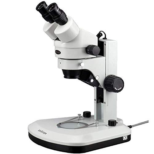 The AmScope SM-1BY-RL professional stereo zoom microscope has a pair of 10x super-widefield high eyepoint eyepieces, a 0.7x-4.5x zoom objective, a 2.0x Barlow lens, and a track stand. The microscope has an overall magnification range of 7x-90x. The binocular viewing head has an interpupillary range of 55 to 75mm, a 45-degree inclination to reduce eye and neck strain, and 360-degree rotation to enable sharing. The WH10x20mm super-widefield high-eyepoint eyepieces combine with the 0.7x-4.5x zoom objective to provide 7x-45x continuous zoom magnification and a longer working distance for inspecting large-scale specimens that require handling or repair. High-eyepoint objectives ease viewing for users who wear glasses, and dioptric adjustment accommodates individual eye-strength differences. The microscope includes a 2.0x Barlow lens that can be added to the objective to increase the magnification range to 14x-90x. A Barlow lens with a magnification greater than 1.0 increases the magnification and reduces the working distance. A stereo microscope, sometimes called an inspection or dissection microscope, has low magnification and a long working distance that enables users to manipulate the object being inspected.