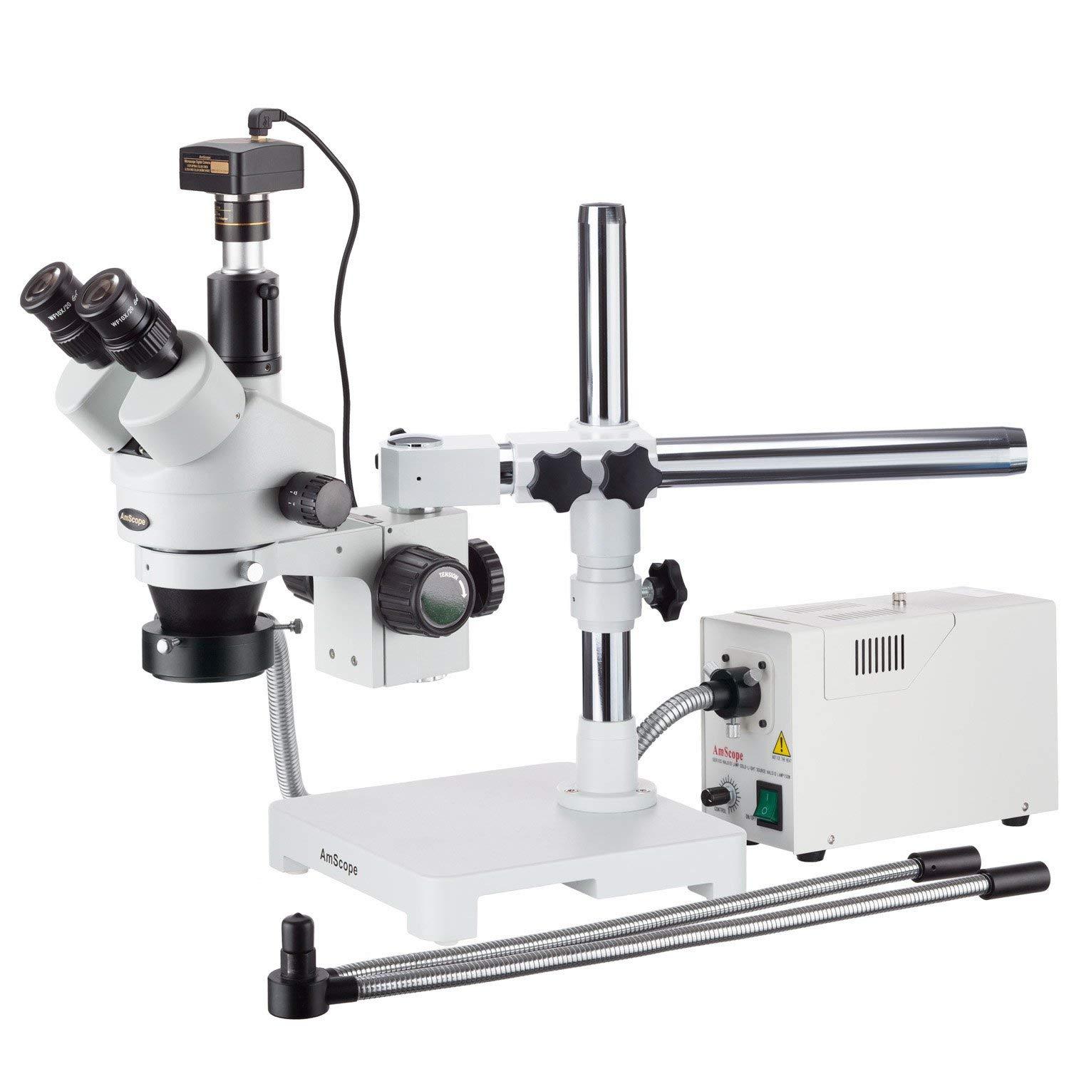 The AmScope SM-3TZ-FODR-10M digital professional stereo zoom microscope has a pair of 10x super-widefield high-eyepoint eyepieces, a 0.7x-4.5x zoom objective, and a single-arm boom stand. The microscope has an overall magnification range of 3.5x-90x. The 10MP camera has a CMOS color sensor, a reduction lens, image capture and editing software, and USB 2.0 output to capture or display still or video images on a computer or projector. The trinocular viewing head has an interpupillary range of 55 to 75mm, a 45-degree inclination to reduce eye and neck strain, and 360-degree rotation to enable sharing. The vertical trinocular port can be used as a C-Mount or 23mm photo port. The WH10x20mm super-widefield high-eyepoint eyepieces combine with the 0.7x-4.5x zoom objective to provide continuous zoom magnification and a longer working distance for inspecting large-scale specimens that require handling or repair. The microscope comes with 0.5x and 2.0x Barlow lenses that can be added to the objective to increase the magnification range. A Barlow lens with a magnification of less than 1.0 reduces magnification and increases the working distance, while a Barlow lens with a magnification greater than 1.0 increases the magnification and reduces the working distance. High-eyepoint eyepieces ease viewing for users who wear glasses, and dioptric adjustment accommodates individual eye-strength differences. A digital stereo microscope, sometimes called an inspection or dissection microscope, has low magnification and a long working distance that enables users to manipulate the object being inspected, and is used where image capture, detailed records, or documentation is required.