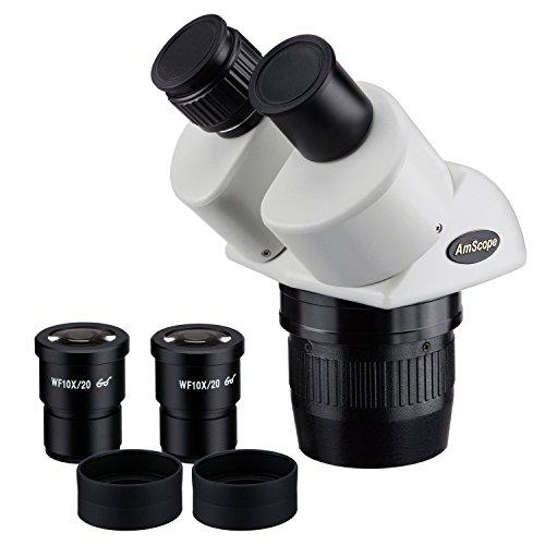 The AmScope SW24B binocular stereo microscope head has a 2x/4x objective and a pair of 10x20mm widefield high-eyepoint eyepieces. The microscope head has a 3" O-ring style mounting ring. The binocular viewing head has an interpupillary range of 47 to 75mm, a 45-degree inclination to reduce eye and neck strain, and 360-degree rotation to enable sharing. The WF10x20mm super-widefield high-eyepoint eyepieces combine with the 2x/4x objective to provide 20x and 40x magnification, and a longer working distance for inspecting large-scale specimens that require handling or repair. High-eyepoint eyepieces ease viewing for users who wear glasses, dioptric adjustment accommodates individual eye-strength differences, and eye guards ensure comfortable viewing. The optical glass lenses provide sharp images, and are fully-coated to ensure high-resolution images. A stereo microscope, sometimes called an inspection or dissection microscope, has low magnification and a long working distance that enables users to manipulate the object being inspected. SpecificationsHeadBinocularMagnification20x, 40xObjective power