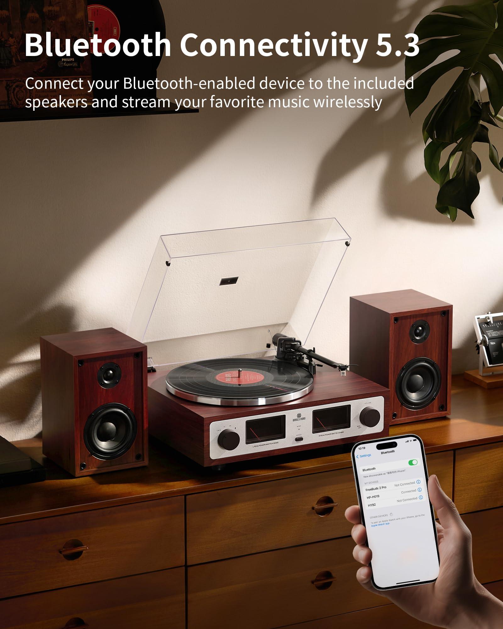 - Bluetooth Music StreamingWith Bluetooth music receiver, you can listen to your favorite music anywhere, anytime via a mobile phone connection without cables and wires. The newest Bluetooth 5.3 Version makes the connection faster and more stable. (Note:This record player doesnt support Bluetooth output, so you can not connect to any Bluetooth speakers.)