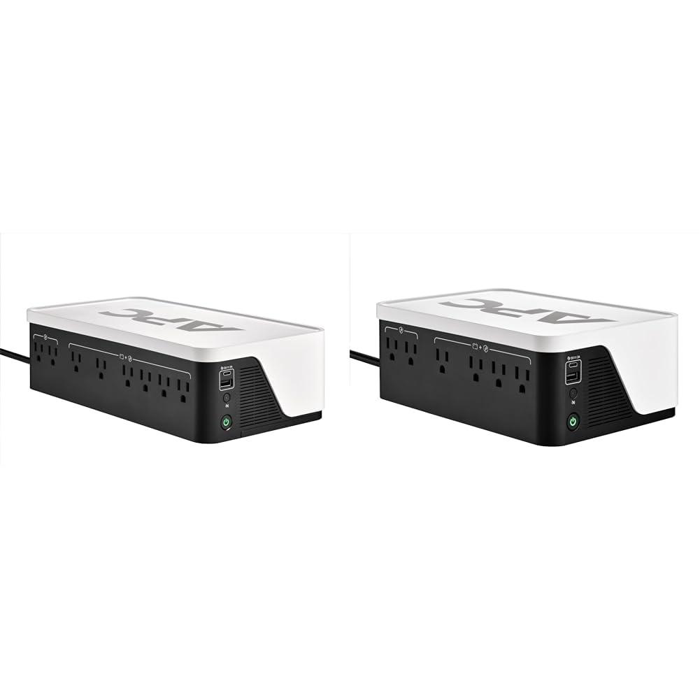 The APC UPS Battery Backup Bundle includes two models of uninterruptible power supplies to keep your home or small business connected during power outages. The bundle contains the BE1050G3 providing 1050VA/600W power capacity and the BE700G3 with 700VA/420W capacity. The larger BE1050G3 UPS has 8 total outlets - 6 battery backup outlets to safely shut down electronics and maintain internet access plus 2 surge-only outlets. It also features user-replaceable batteries, USB-C and USB-A charging ports, and software for power management. The compact BE700G3 UPS includes 4 battery backup outlets and 2 surge-only outlets. It shares the same modern USB charging options while supporting active power factor correction for compatibility. With different power capacities, the two APC UPS models complement each other well. The high-capacity BE1050G3 can handle larger home and small business loads to provide longer runtimes during outages. After heavy devices are powered down, the BE700G3 continues supplying battery backup to essential networking equipment and phones. Together, this bundle offers reliable electricity and peace of mind across blackouts.