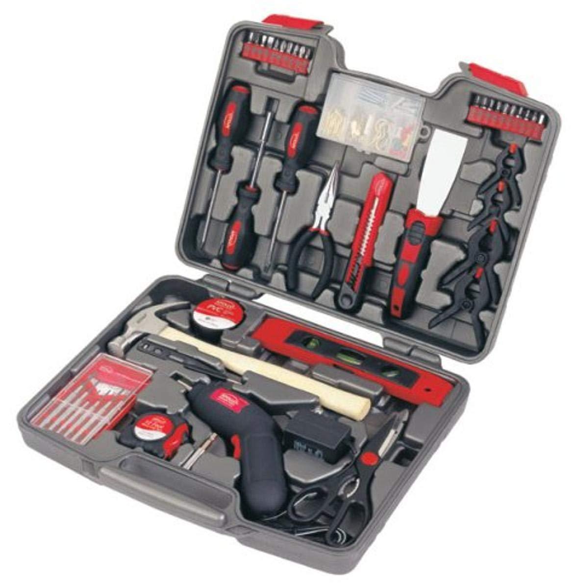 This 144 piece household tool kit with 4.8V cordless screwdriver contains all the tools needed for most repairs around the home. The tools are heat treated and chrome plated to resist corrosion, and held securely in a handy blow molded case. Contains: 4.8 Volt Rechargeable Cordless Screwdriver, 12ft (3.5m) Tape Measure, 7oz Claw Hammer, 6" Long Nose Pliers, Putty Knife, Bit Driver, Ten 1" Bits: 1/8", 5/32", 3/16", 1/4", PH1, PH2, PH3, PZ1, PZ2, PZ3; Ten 1" Bits: T10, T15, T20, T25, T27, T30, 1/8", 5/32", 3/16", 1/4"; 2" Bit Connector, 18mm Utility Knife, Phillips 4" x #2 Screwdriver, Slotted 4" x 1/4" Screwdriver, Six Precision Screwdrivers: Phillips #1, #0, Slotted 1.4mm, 2mm, 2.4mm, 3mm, 9" Level, 8" Scissors, Two 2-1/2" Spring Clamps, Two 3-1/2" Spring Clamps, Digital Voltage Tester, PVC Electrical Tape, One Hundred Picture Hanging Fasteners.