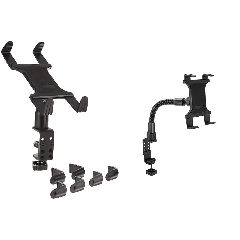 - Includes heavy-duty steel C-clamp tablet holder with 12 inch flexible gooseneck to mount securely on surfaces up to 2.25 inches thick, rotates 360 degrees (product 1).