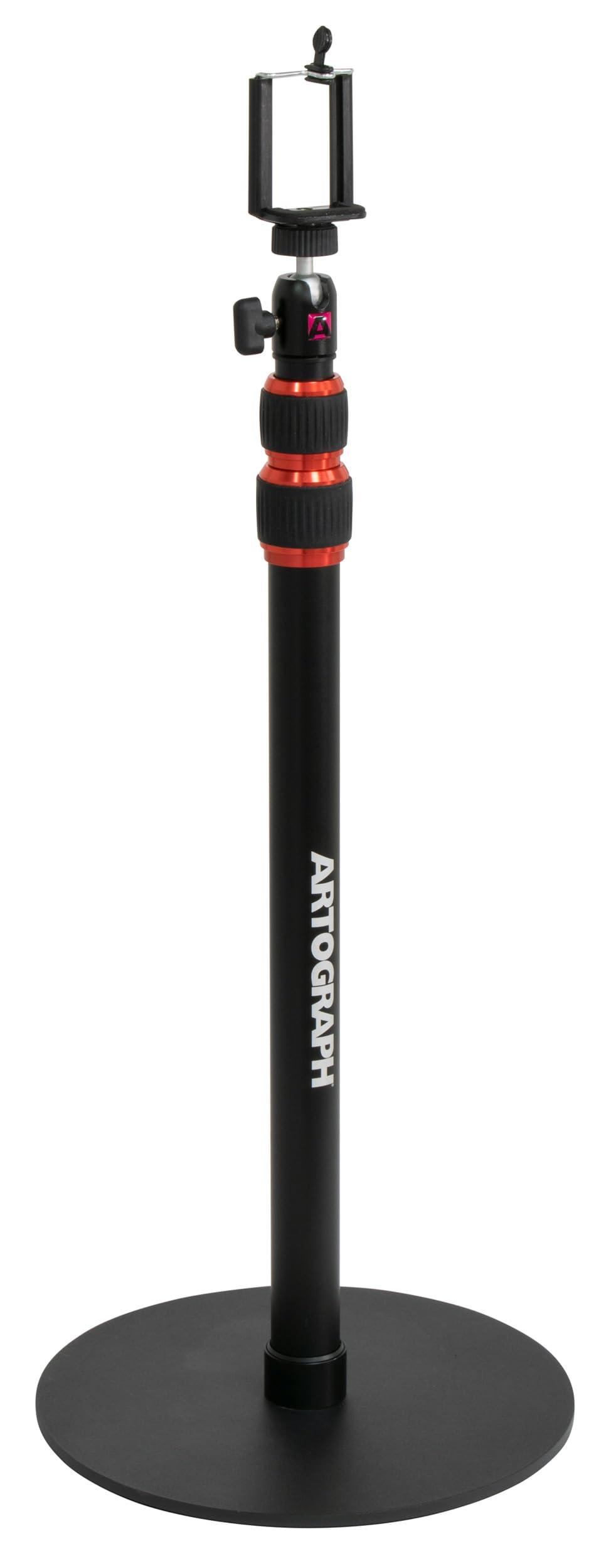 The Artograph Digital Projector Table Stand features both a standard 3/16" (5mm) attachment bolt as well as a 360 swivel ball adapter with a 1/4" (6mm) bolt. These bolts provide versatility so it can be used with our digital projector, camera, or lights. The swivel ball allows you to easily attach and position your attachment and provides up to a 90 tilt in any direction. Project an image onto a wall or down to your desktop for tracing. We also provide a spring-loaded cell phone holder that extends 2-3. The height can easily be adjusted from 19- 49. The metal base has a padded bottom to prevent scratching. It is easy to assemble and has a one-year warranty.