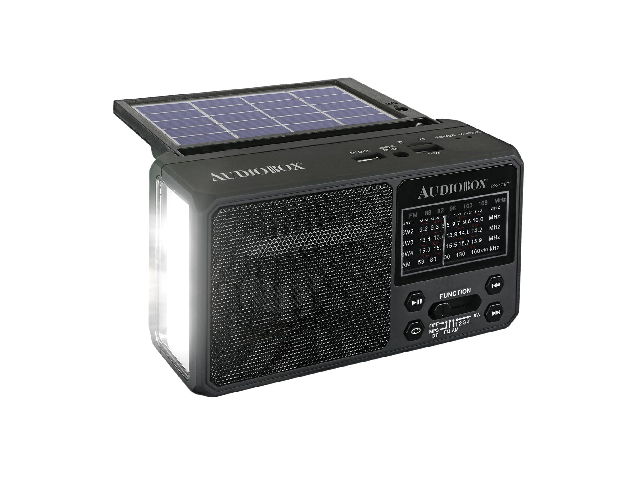 Be prepared with the Audiobox Multiband Solar Radio! This Audiobox solar radio features a 6-band emergency shortwave radio, solar charging panel, and battery. Connect to Bluetooth or play downloaded content from USB/microSD Card media. It also features a built-in LED flashlight.