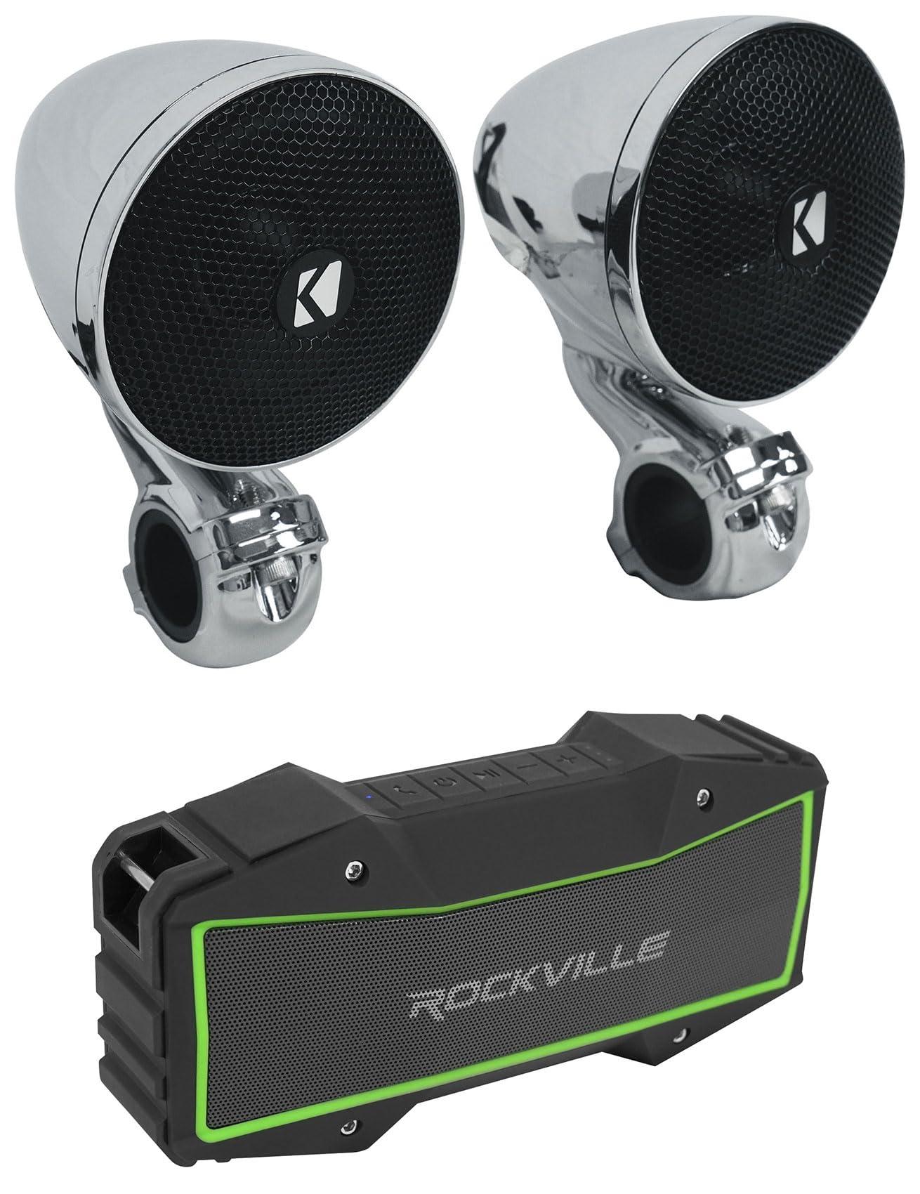 - Package Includes: (1) (2) Kicker 47PSM32 3" 100w PSM Motorcycle/ATV Handlebar Speakers in Chrome PSM32, (1) Rockville ROCK EVERYWHERE Portable Bluetooth Speaker/Waterproof/Wireless Link