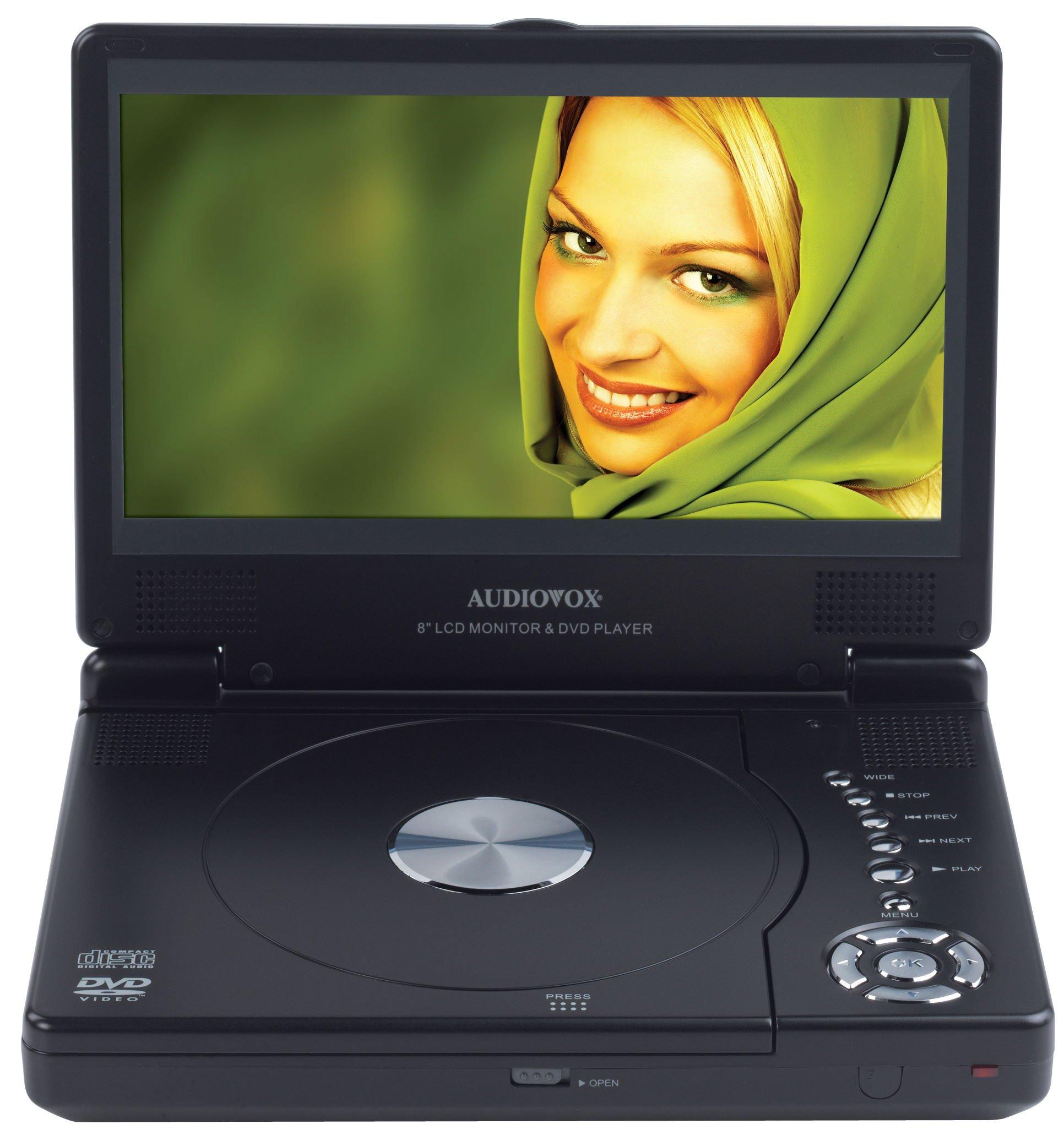 Audiovox D1809 portable DVD player gives you the ability to enjoy a home theater experience away from home. Make time fly on a road trip, commute to work or plane ride. Enjoy the convenience of the slim line design making it easy to store and carry in a backpack or luggage. The portable player has an 8-inch LCD high resolution monitor offering the ideal 16:9 aspect ratio viewing. The portable player comes with two headphone jacks allowing two people to watch movies simultaneously; or multiple viewers can enjoy the player using the built-in stereo speakers. The D1809 is compatible with CD, MP3, CDR, CDRW and Picture CD giving you the freedom to enjoy more than DVDs. The top loading disc access makes it easy to switch between different movies and eliminates the possibility of discs getting stuck inside the player. Connect the portable player to your home television via the included AV cables and use it as your home DVD player. The player includes a built-in high capacity rechargeable battery offering up to two and a half hours of battery life perfect for any plane ride. Other accessories include A/V cable, car power adapter, remote control and AC adapter.