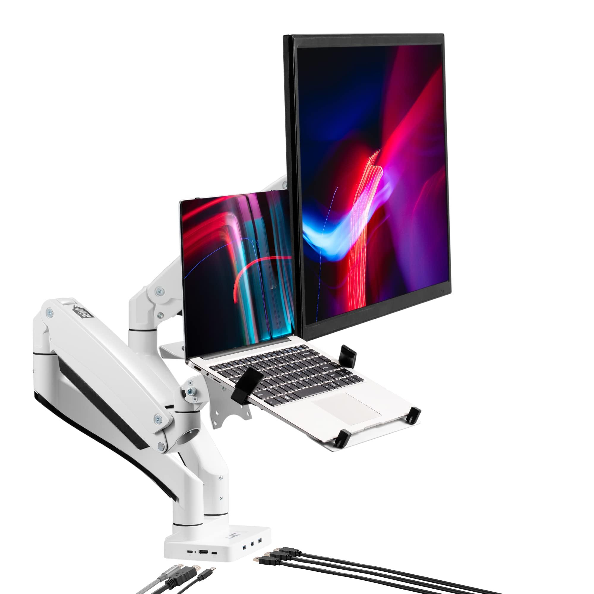 - Attachable Laptop Tray - Versatile and adaptable. Use either as a dual monitor mount, or as a single monitor mount with a laptop holder to accommodate your laptop, tablet, or keyboard, providing you with optimal flexibility and functionality.