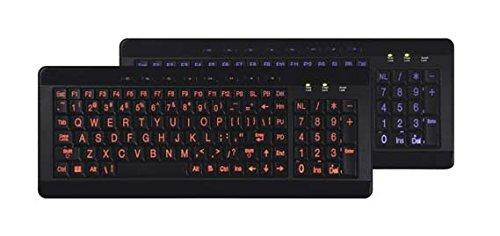AVS Gear W9870 Large Print LED Keyboard Key-caps are 400% larger than the prints on a standard keyboard for enhanced visibility. Built-In Multimedia. Quick access hotkeys. Two Changeable LED Colors: Blue and orange. Keyboard Compatibility: Windows 2000/XP/Vista/7/ME/NT.