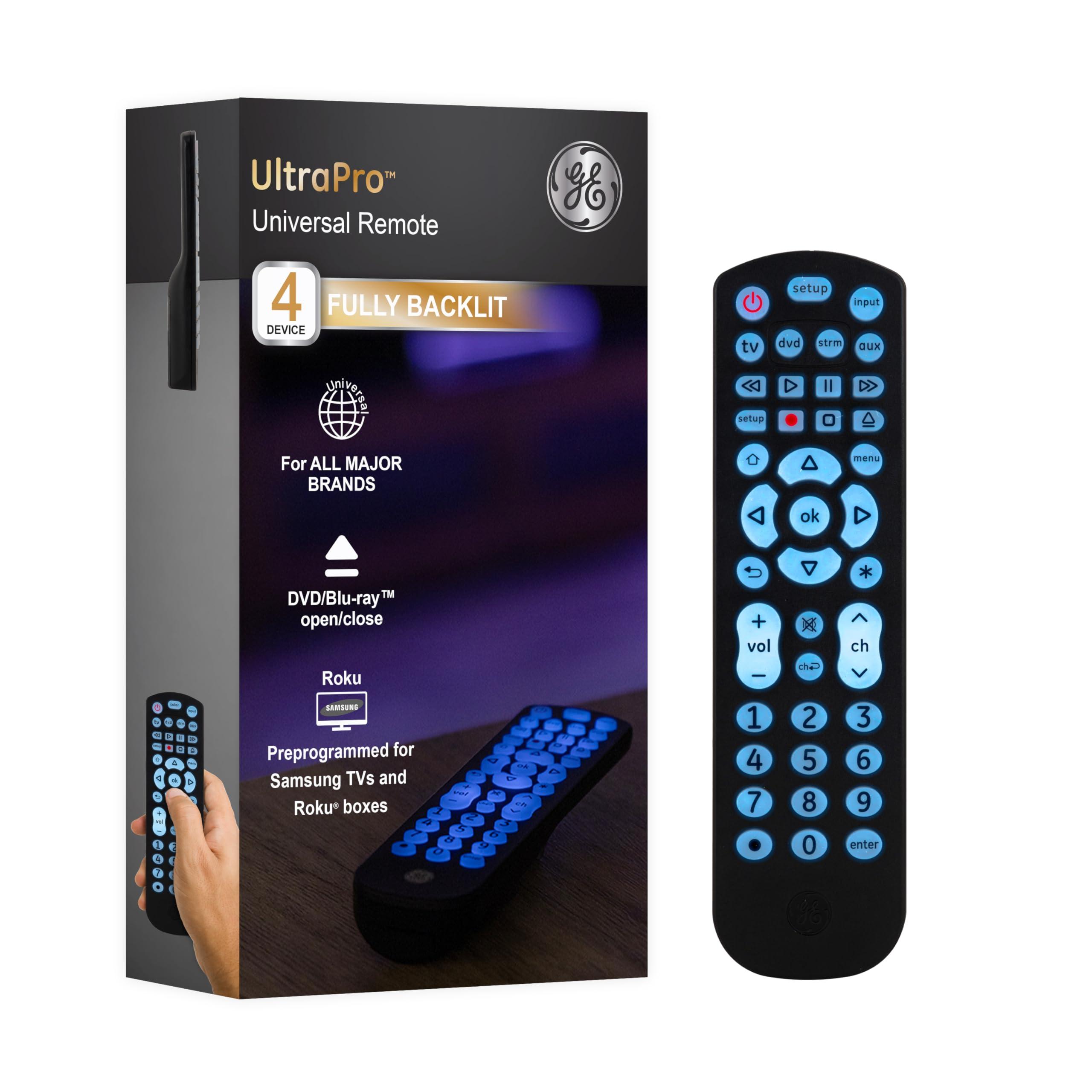 Settle in for the night with the GE-branded 4-Device Universal Remote in a classic black finish. No more worries about keeping track of multiple controllers. This universal TV remote can operate up to four devices, including your TV, Blu-ray/DVD player, streaming media player, cable, satellite, soundbar and more. Eliminate the hassle of managing more than one remote and enjoy having full control at your fingertips. Preprogrammed for immediate use with Samsung TVs and Roku boxes, this universal remote control offers simple, userfriendly setup with your choice of automatic code search or direct code entry programming. The master volume control feature allows you to adjust the audio regardless of which device is being used. Full backlighting with soft blue LEDs gives you enhanced visibility when operating your remote in low-light settings. For added convenience, this universal TV remote control includes a Blu-ray/DVD player open/close button, simple menu navigation, a dot button for sub-channel access and a favorites button to store up to 10 of your most-watched channels for quick access. Organize your entertainment with this GE-branded 4-Device Universal Remote.