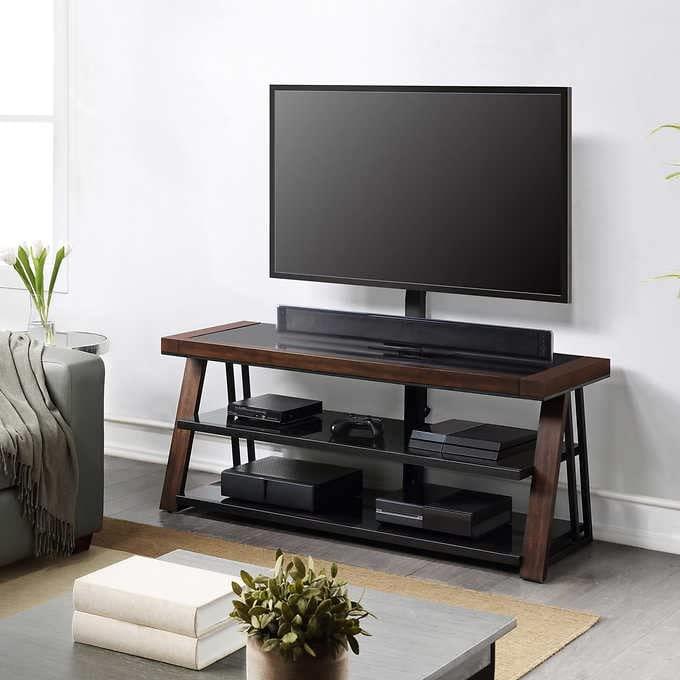 The Harlowe 3-in-1 Stand for you flat-panel TV that hold up to 65" has found a home, it will keeps all your entertainment gear in one convenient place, with an expansive shelf for your TV and two more shelves for components, remotes and more. The sturdy steel frame, composite wood construction and tempered glass shelves provide a strong base and includes cord management and adjustable levelers in the back.