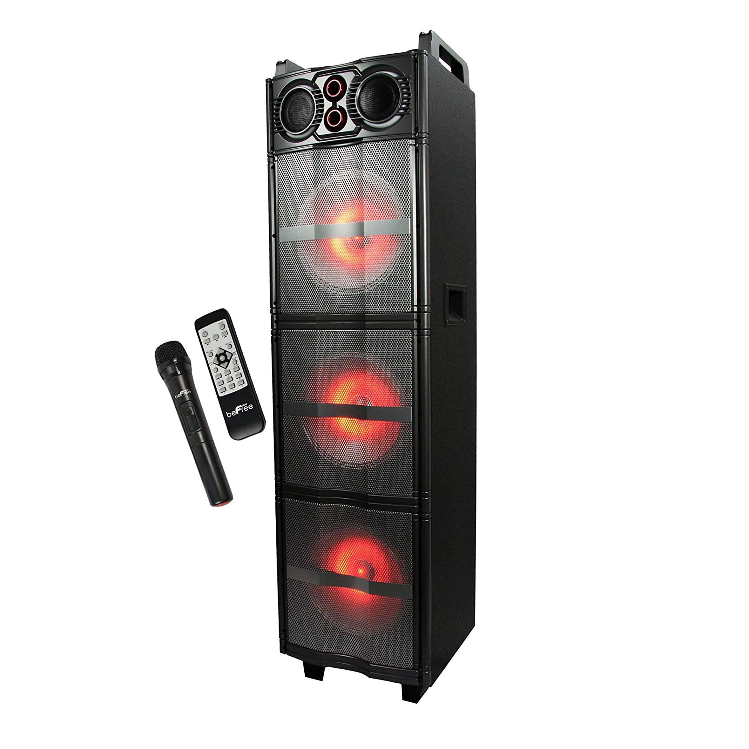 beFree Sound's Triple 10 Inch Subwoofer Portable Bluetooth Speaker with Party Lights is the ideal all in one party companion! This Speaker not only delivers clear and extremely powerful sound, but also provides a stunning light show all night. Each of the three large 10 inch Sub-woofers has built in reactive party lights which illuminate and liven up any rave. The unit features a top control panel with two large lit up volume control nobs each featuring a stunning blue halo light. Separate volume control for the included Microphone and the general speaker volume allow you to control the sound settings to perfection. You can even use the remote to change tracks and adjust everything from input to volume from across the room. Includes One Portable Speaker (51.1" x 15.1" x 15" - 45.3 lbs), One Remote Control, and One Wireless Microphone Whether you use this tall speaker for public speaking, or social events, you simply can't go wrong.