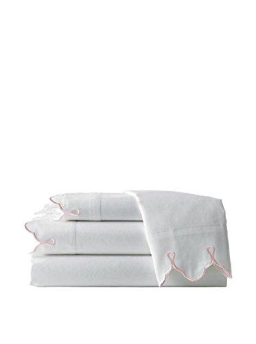300- TC sheet scalloped sheet set is made from fabric woven to the highest specifications. Single ply combed cotton yarns are utilized to weave a sateen fabric resulting in a superior base for an extraordinary soft sheet set. The intricate embroidered pattern is produced by hand guided embroidery machines with each piece made by an individual technician. Flat sheet is oversized to extra luxury dimensions insuring a generous turn back. The pillow cases feature intricate embroidery. The French cuff has a capture to hold the pillow inside the case. Fitted sheet fits up to an 18 inch mattress. Single ply threads are employed to weave a single pick (the best) sateen fabric for softness and performance.