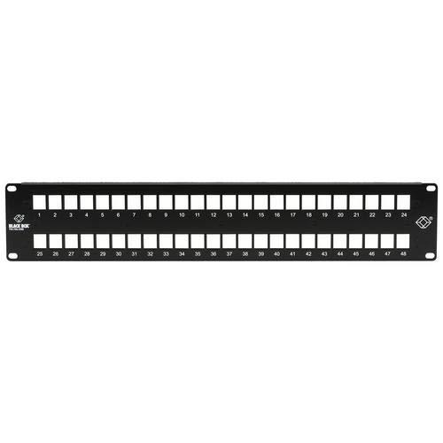 JPMT1048A, Multimedia Patch Panel - 2U, 48-Port Features: Supports UTP, STP, fiber, and S-Video applications. Flexible and modular; high-density design enables optimum use of rack space. Constructed of cold-rolled steel. Holds GigaTrue2 CAT 6, GigaBase2 CAT5e, CAT3, and USOC Jacks. Works with GigaStation2 Snap Fittings. Black Box High-Density Multimedia Patch Panels have the flexibility, modularity, and connection density you need. They support many media types, including jacks and adapters for copper UTP and STP, S-Video, and fiber. The patch panel's maximum-density design makes the most of your precious rack space. It holds 36 connectors in just one rack unit of space! The industry-standard keystone openings enable flush fitting of jacks, which makes connections look neat.