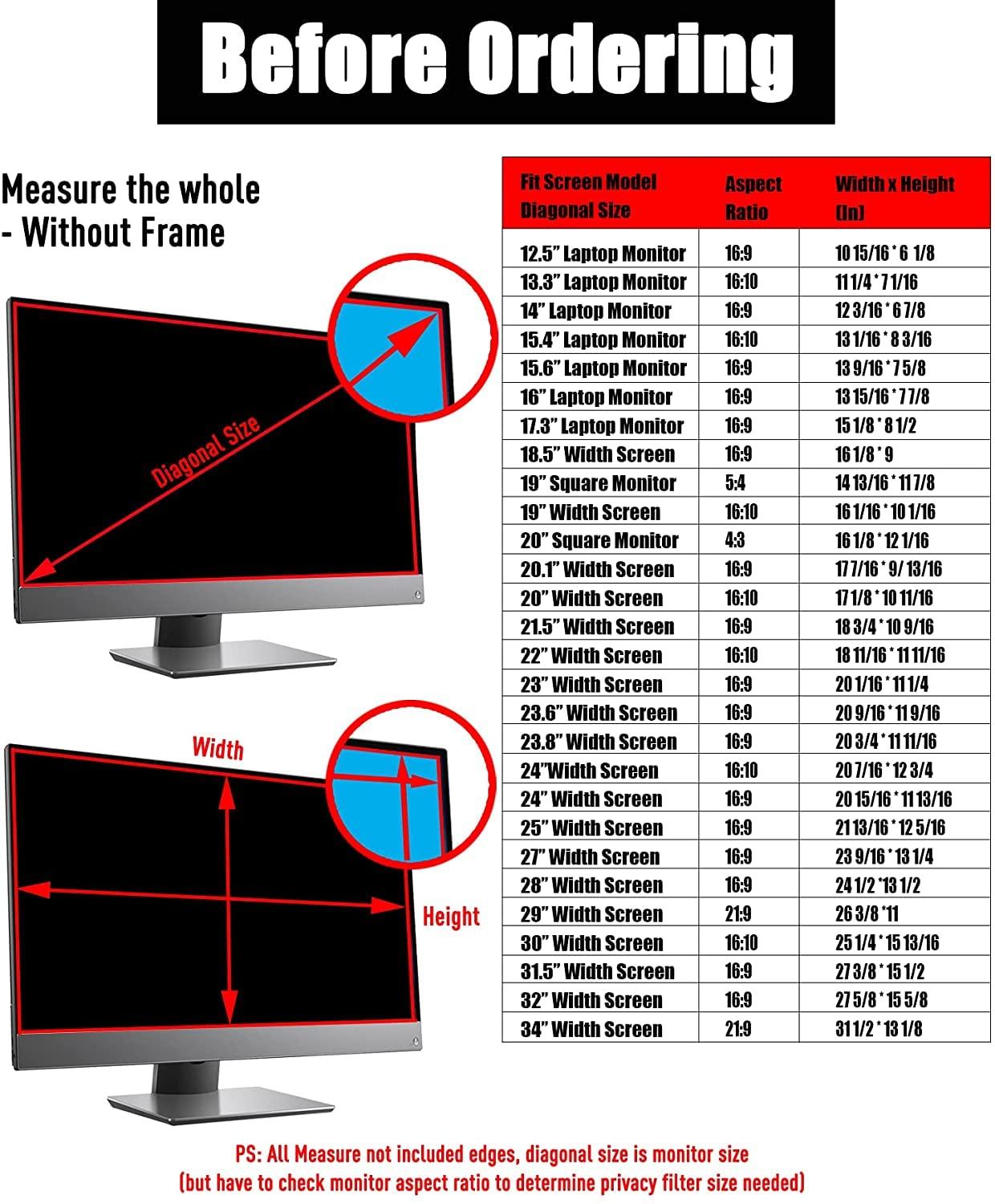 - Privacy filter size: width: , diagonal: 24" 25" 26" 27" 32", blackout privacy screen filter design compatible with HP , Dell Dell, Samsung, Lenovo, LG, Acer, Asus and other monitor brands. Please confirm the width and height measurements of your computer screen before ordering. It is not recommended to choose only based on the diagonal size of your computer screen.