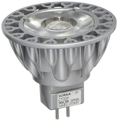 7.5W SORAA V3 Vivid MR-16 12V GU5.3 Bi-Pin Base 2700K Narrow Flood 25 Degree Beam Spread 35,000 Hour Dimmable LED Light Bulb - 50W Halogen Equivalent - Ideal for commercial applications; commonly used in retail, thaters and art exhibits - Proprietary fanless aluminum design provides superior thermal dissipation - Works with trailing edge and leading edge phase cut dimmers - Suitable for fully enclosed fixtures per UL 1993 - Can be used with front glass cover - Suitable for damp locations per UL - Applications: Landscape, Recessed, Track Lighting