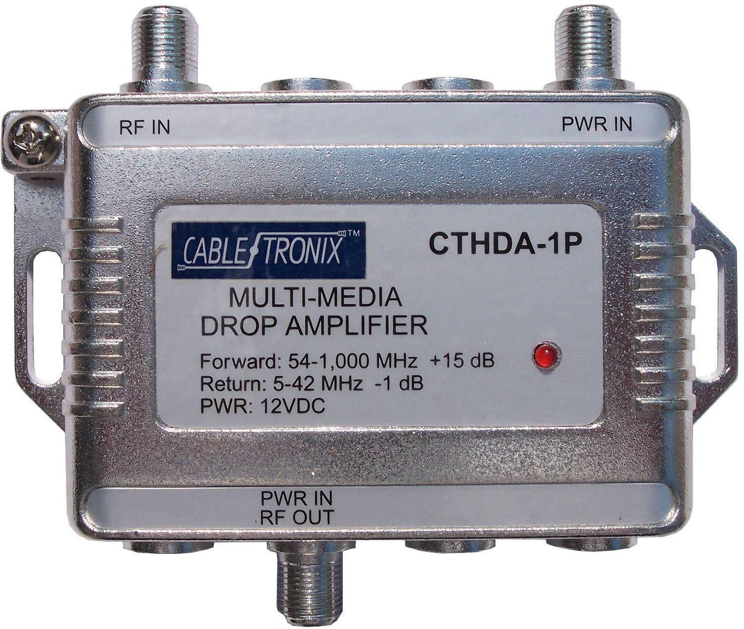 The CT-HDA-1P 1 GHz Single Input/Output Multimedia Drop Amplifier from CableTronix is designed for use in CATV systems that require two-way multimedia networking. The amplifier features one input and one output and offers a forward gain of 15 dB and return gain of -1 dB.