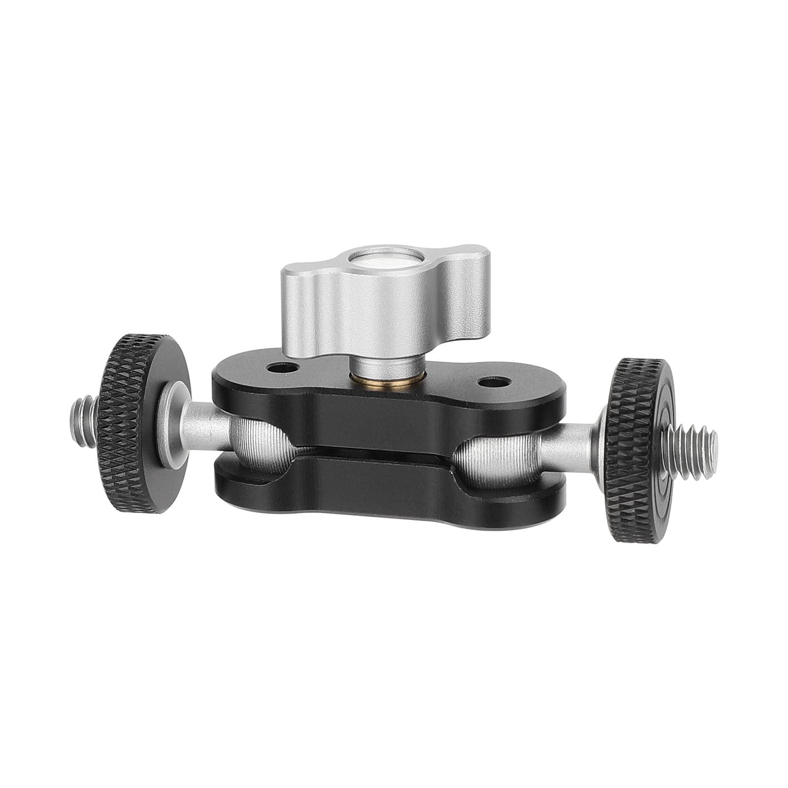 The double ball head mount can be used to mount an accessory onto your camera rig at almost any angle. It features a 1/4"-20 ball heads at both ends with a knurled thumbwheel for attaching your accessory. A single silvery thumbscrew fixes the position of both ball heads. The mini ball heads are carved for more frictions, and swivel up to 360 for flexible positioning. Suitable for a wide range of camera accessories, small lights, or sound gear, the ball head mount is constructed from anodized aluminum and steel.