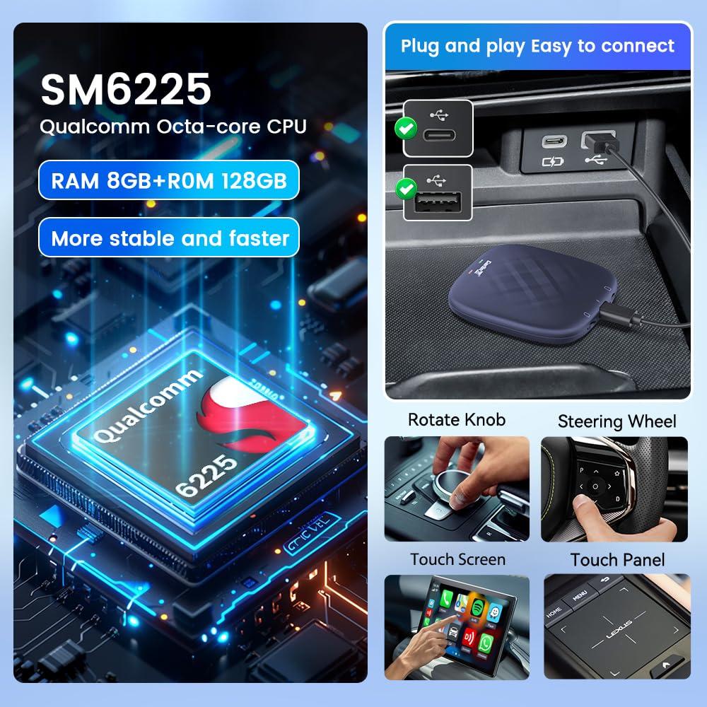 - High-Performance Car Streaming Box Equipped with Android 13.0, 8-core SM6225 processor, and 8GB+128GB storage for fast, smooth streaming.