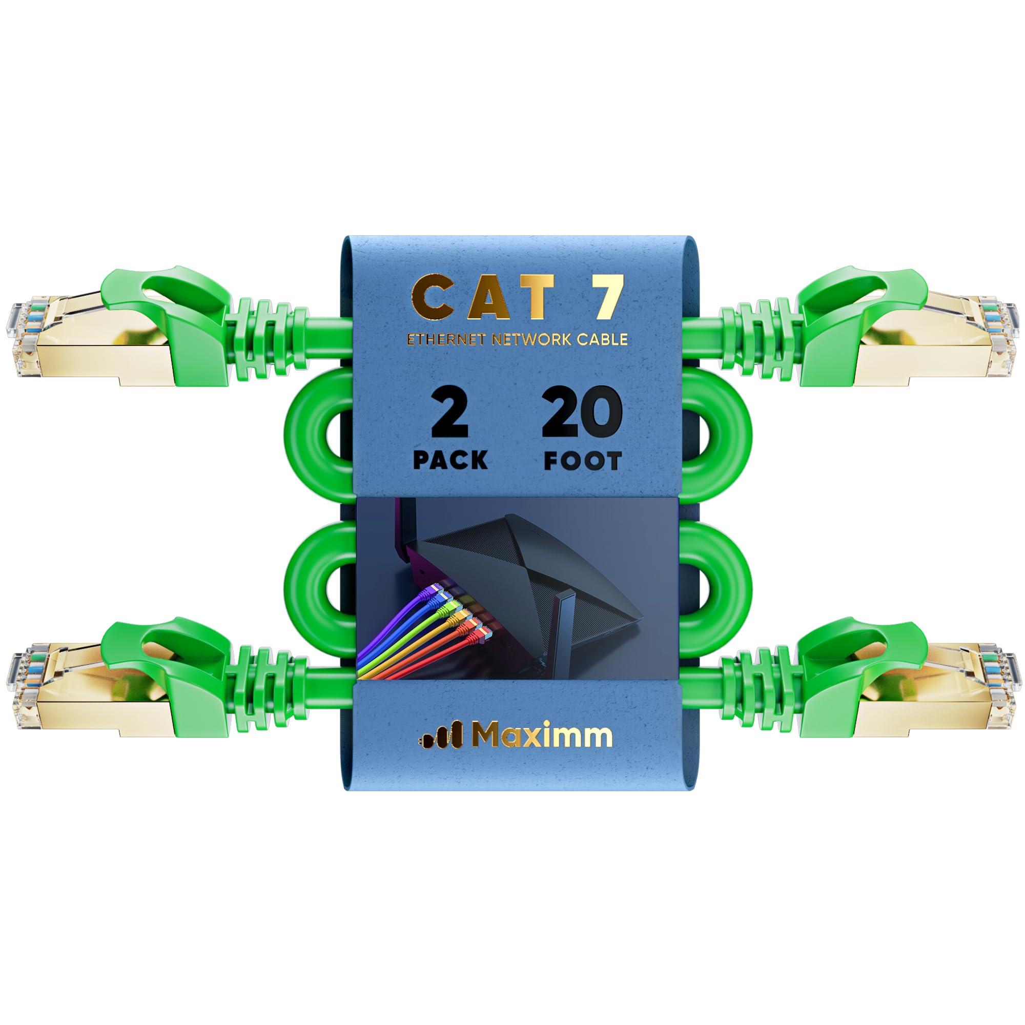 Maximm Cat 7 Ethernet Cable 20 ft - (2 Pack) High-Speed Cat7 Internet & Network LAN Patch Cables, RJ45 Connectors - Perfect for Gaming, Streaming, and More (Green)