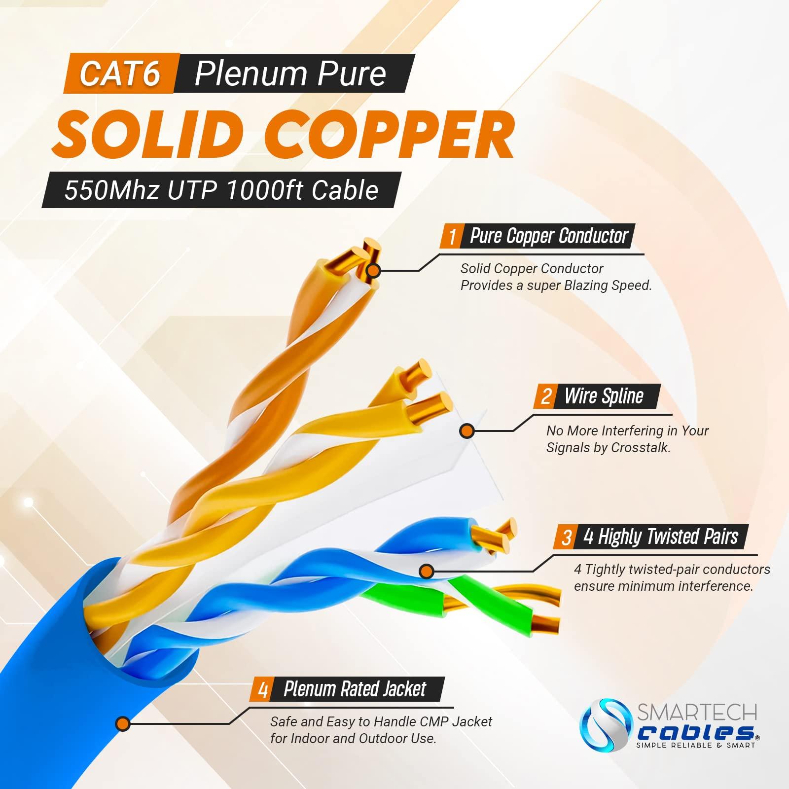 - % : Our Cat6 plenum 1000ft cable, a pure copper cable provides top-notch speed and performance. The 23 AWG Cat6 (CMP) cable with 4 pairs (8C) is ideal for 1 Gigabit and 10 Gigabit and tested bandwidth of up to 550 MHz.