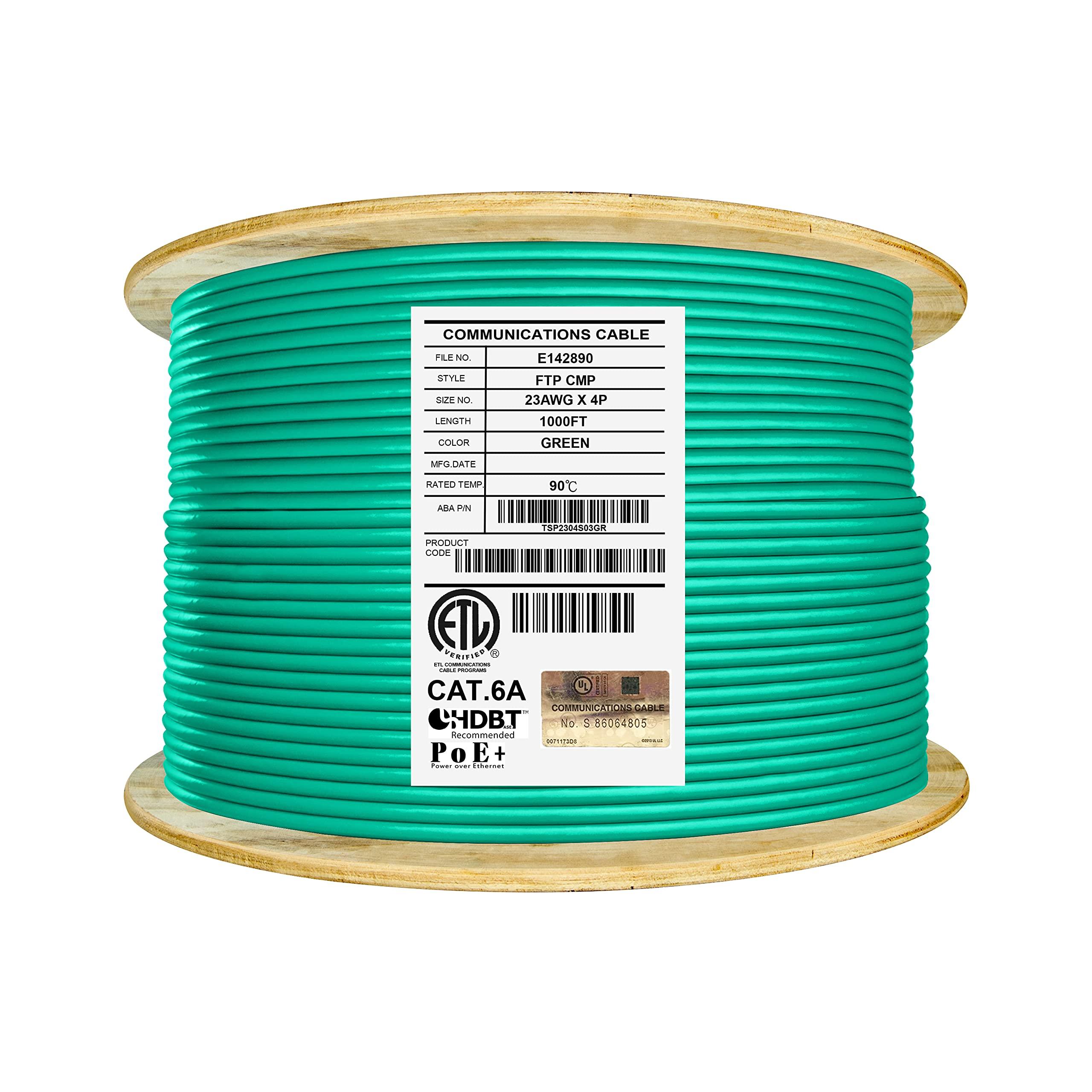- CAT6A Shielded Plenum bulk cable in green is 1000ft, 4 Pair, Foil Twisted Pairs (FTP), 23AWG, Solid Bare Copper Conductors for optimal signal strength. Top rated performance with 3-5 dB extra margin over EIA/ TIA-568.2-D standards. Fluke Tested. Suitable for PoE, PoE+, PoE++. The only Cat6A shielded plenum cable with UL-LP Certification for safety compliance at PoE operation during increased power and heat generation.