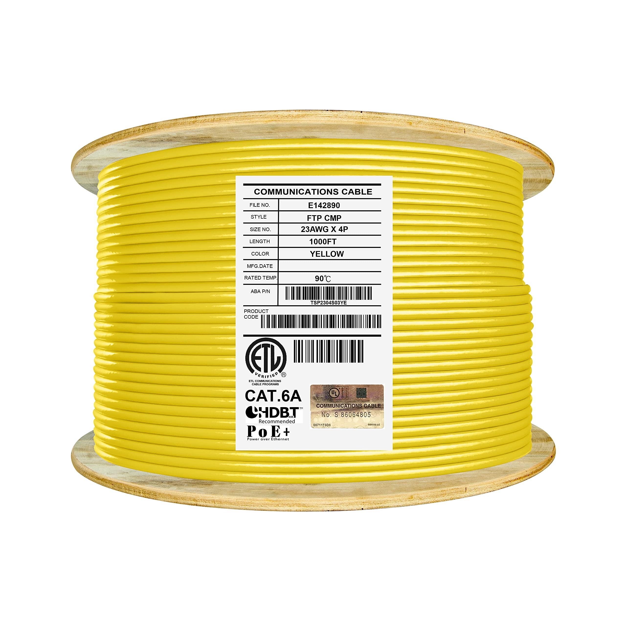 - Cat6A Shielded Plenum bulk cable in yellow is 1000ft, 4 Pair, Foil Twisted Pairs (FTP), 23AWG, Solid Copper Conductors for optimal signal strength. Top rated performance with 3-5 dB extra margin over EIA/ TIA-568.2-D standards. Suitable for PoE, PoE+, PoE++. The only Cat6A shielded plenum cable with UL-LP Certification for safety compliance at PoE operation during increased power and heat generation. Our Cat6A has been tested with a Fluke DSX-8000 Versiv Cable Analyzer.