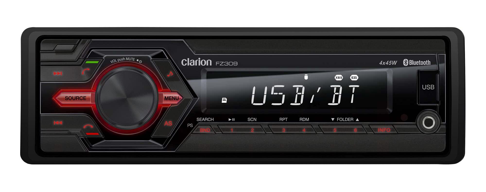 Clarion FZ309 is a single din car stereo media receiver (no CD), with a detachable front panel, remote control, 45 wts x 4 power, Bluetooth technology, Front USB and AUX inputs, MP3. The contrasting red and black tones of this device add a sense of cool to your dashboard. Its the perfect fusion of design and operability, with easy-to-reach buttons located right next to a large volume knob. FZ309 s built-in wireless Bluetooth interface supports HSP/HFP for hands-free operation. You can easily communicate with the outside world by listening to phone calls through the cars audio system and talking through the embedded microphone. And with A2DP/AVRCP support, you can enjoy music streamed from your mobile phone. ust connect your iPhone to the source units USB port to access and play music through your cars audio system. Music search is possible using the source units controls. The front USB slot also supports playback of MP3 and WMA format audio files, so you can save your favorite music onto a USB or SD memory device and enjoy them in your car. TUNER Frequency Bands : FM/AM FM : 87.5 MHZ to 107.9 MHZ, step: 200KHZ AM : (kHz) 530 to 1710, steps : 10 kHz FM usable sensitivity (dBf) 15 FM alternate channel selectivity (dB) 60 FM stereo separation @1 kHz (dB) 25 FM stereo freq. resp. @ 3 dB (Hz) 30 to 15,000 Bluetooth Bluetooth Version 3 File System Power class 2 CONNECTION FOR USB USB Requirements USB 1.1 / 2.0 USB Class Mass Storage Class File System FAT 12/16/32 MP3 Decoding MPEG-1/2 AUDIO Layer-3 WMA Decoding Windows Media Audio AUDIO MAXIMUM POWER OUTPUT 45W x 4 GENERAL Dimensions (W H D) (Inches) 7.4 2.2 4.8 Dimensions (W H D) (mm) 188 57.8 122 Remote control (W H D) (Approx Inches) 2.7 1.3 0.3 Remote control (W H D) (Approx mm) 70 34 10 Weight (Lbs) 1.5 Power Requirement 14.4 DC (10.8 - 15.6 V allowable) Power consumption less than 15 A Speaker Impedance 4 (4 to 8 allowable) Pre-Maximum Output Voltage 2V / 10 k Maximum Mounting Angle 30