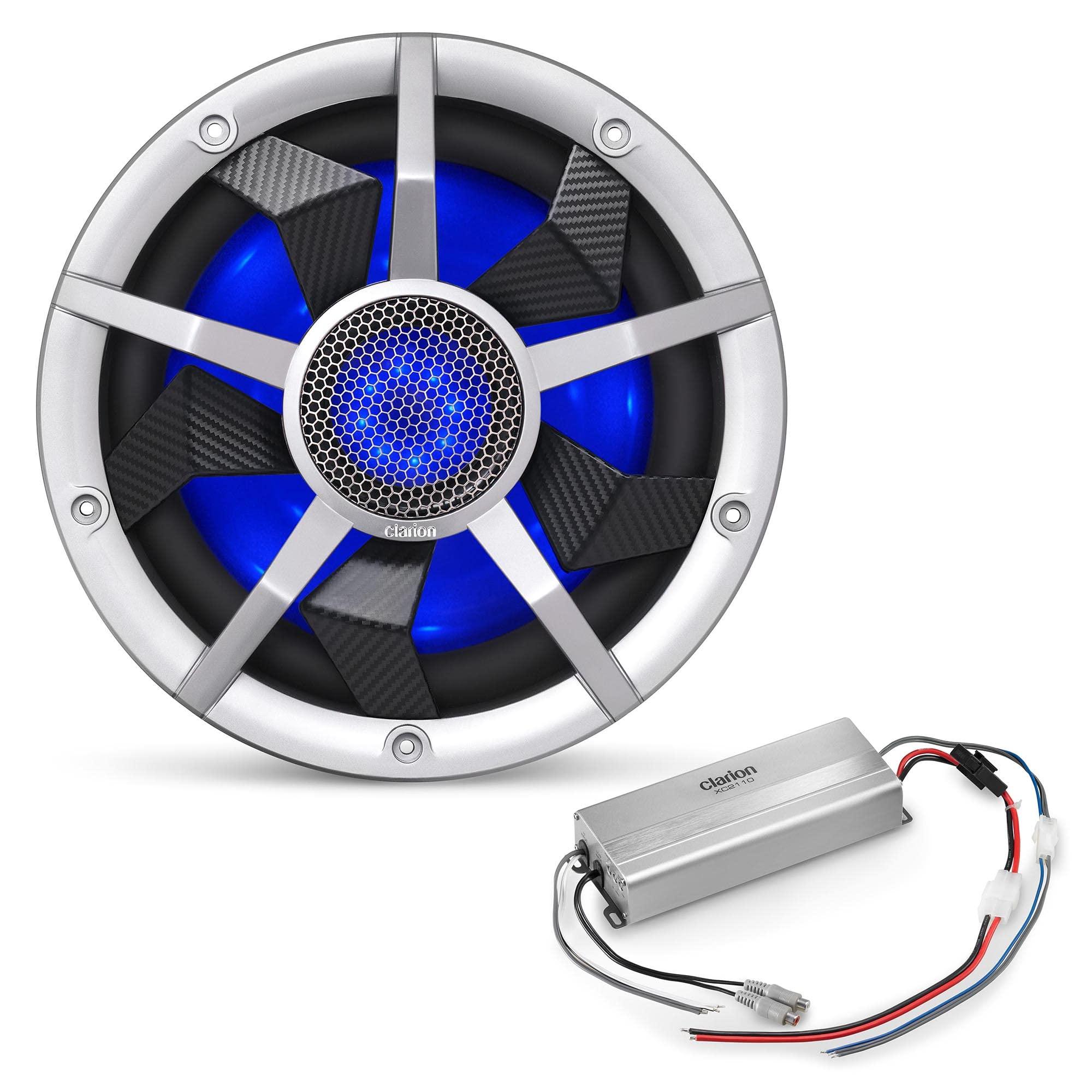 Clarion Marine Subwoofer Amplifier Bundle - 10" CM2513WL LED Sub Woofer and XC2110 Amplifier - This bundle includes: Clarion CM2513WL 10-inch Marine Subwoofer 250W RMS power handling Dual 2 ohm voice coils Built-in RGB illumination Includes Black & Silver Grilles, Clarion XC2110 Compact Mono Subwoofer Amplifier Rated Power (1% THD+N, 14.4V): 200W x 1 @ 4 ohms / 300W x 1 @ 2 ohms Features: variable Low-Pass Filter and variable Bass Boost, and a Creative Audio coozy.