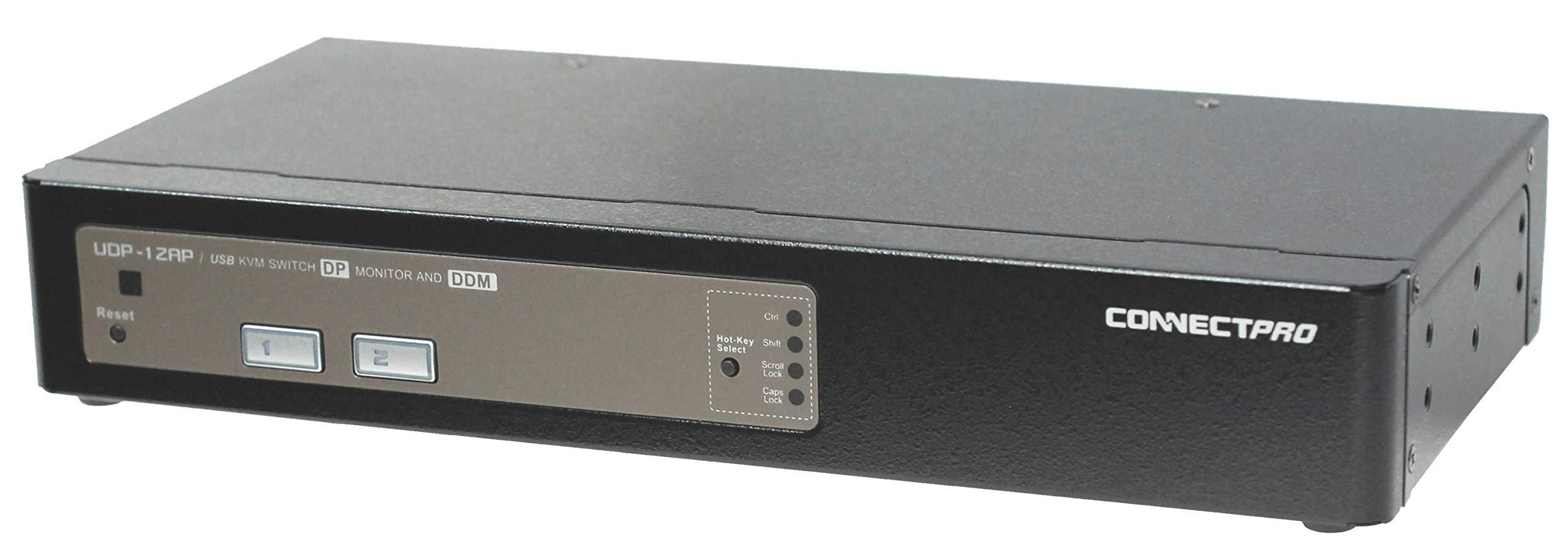Industry-grade DDM class DisplayPort 1.4 USB 3.0 KVM switch for sharing one monitor, USB 3.0 devices for two computer systems or laptop computers. UDP-12AP USB KVM Switch with DisplayPort v1.4 has embedded DDM Technology that can maintain the compatibility of the shared devices and connect systems. As a result, the UDP-12AP becomes the most reliable and robust single monitor DisplayPort KVM switch in the world. UDP-12AP provides premium video that supports DisplayPort 1.4 on your monitor. The UDP-12AP, as with all ConnectPRO KVM switches, features all-the-time active DDC/EDID communication, which makes this switch Windows 7/8/10/11 compatible. The UDP-12AP 2-Port USB DisplayPort 1.4 KVM Switch with Audio and USB 3.0 Hub combines next-generation digital display standards with seamless KVM control, allowing you to switch between DisplayPort systems. Delivering multi-computer control for high-res multimedia applications, the KVM switch supports high resolution and high refresh rate up to 4k 120hz, 3440x1440 144hz, 2560x1440 185~144hz when using the KVM switch in conjunction with fiber optic DisplayPort 1.4 cables or VESA certified DisplayPort 2.1 Cables (depending on user computer hardware combination). The KVM switch also support DisplayPort HD audio, as well as 2-channel analog stereo audio and microphone input. Suitable for high quality static imaging, such as medical applications (MRI, X-ray, etc.), Higher resolution is supported at reduced refresh rates.