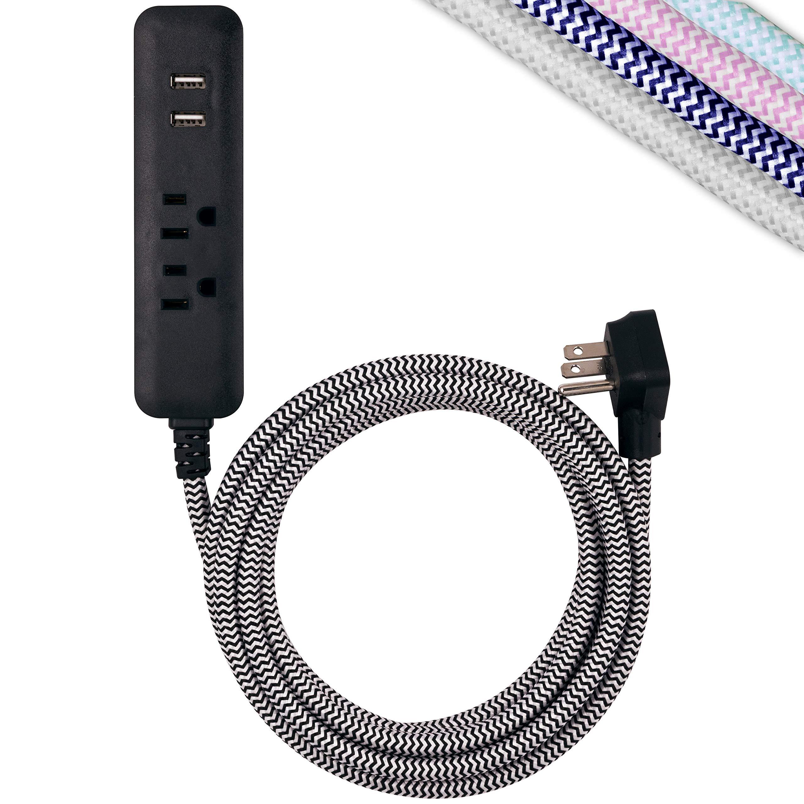 Extend your style into the future with the Cordinate 2-Outlet 2-USB Port Extension Cord. While most cords interrupt or distract from your homes dcor, this unique designer cable only contributes to the overall charm of your space. The 10ft. woven black and white chevron fabric cord cover accents your home or work setup, increases the cables durability and keeps the cord from being bent and tangled. The thoughtful construction of the extension cord includes a space-saving flat plug, making it convenient to connect your devices where space is limited. This unit features dual USB-A ports for connecting two devices at once, with a total charging capability of 2. 4A/12W. Conveniently charge your smartphone, tablet or mobile device from your centralized powering station. Additionally, the extension cord includes built-in surge protection to ensure that your connected equipment stays safe from harmful voltage spikes. For a premium design that offers equal parts fashion and function, choose the Cordinate 2-Outlet 2-USB Port Extension Cord.