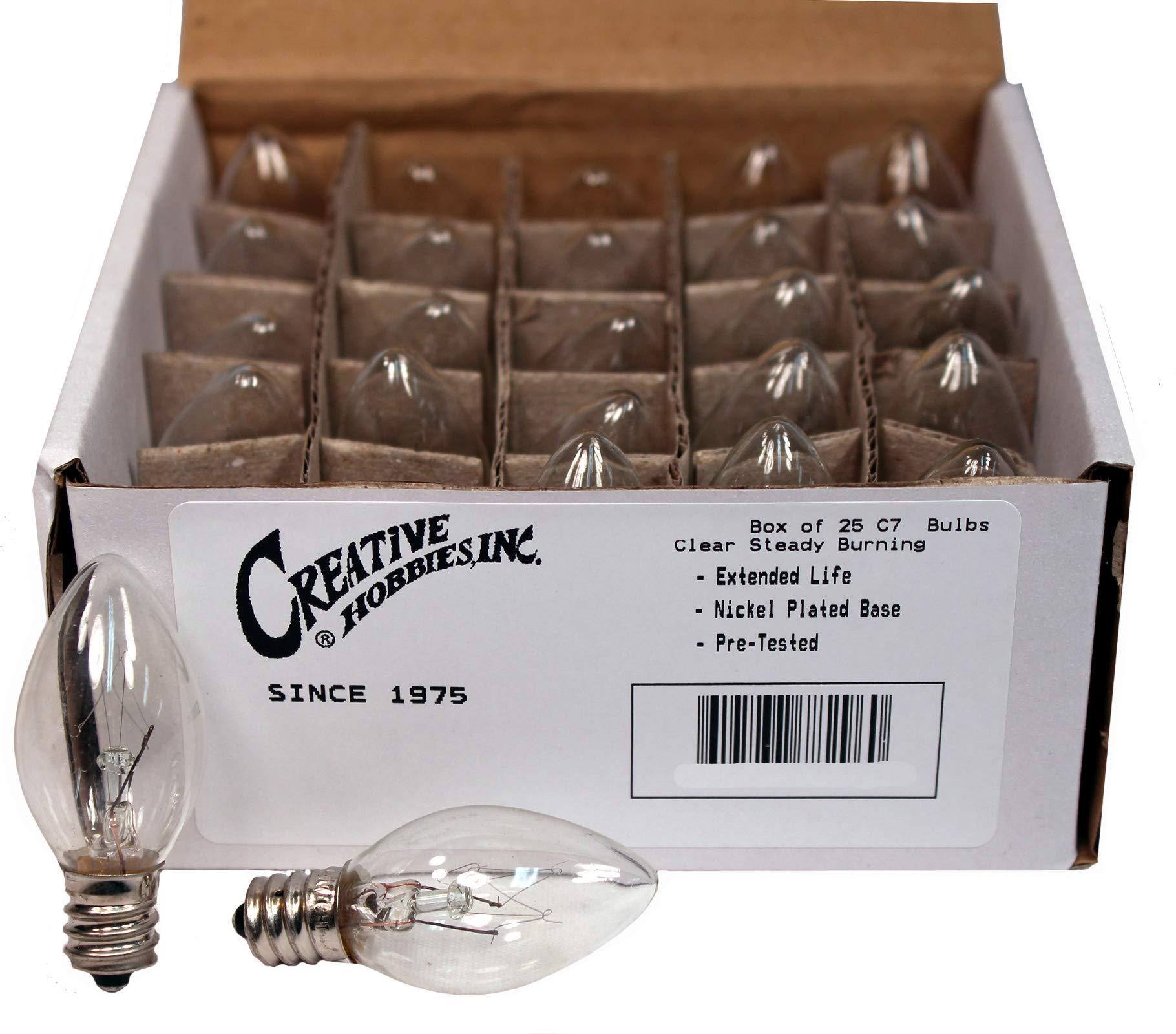 Illuminate your home with the classic warmth of Creative Hobbies' 25 Pack of Incandescent C7 Clear Night Light Bulbs. These bulbs are specifically crafted to offer a steady and reliable light source for various lighting fixtures, including elaborate chandeliers and quaint night lights. With a standard candelabra E12 base, these bulbs seamlessly fit into smaller sockets, ensuring a broad compatibility with your existing decor. Each bulb shines with a clear, unobstructed light, enhancing the aesthetic of any room while providing a comforting presence through the night. Crafted for durability, these bulbs boast an average lifespan of 1,500 hours, reducing the frequency of replacements and saving you time and money. Whether you're setting the mood for a special occasion or simply brightening up your living space, these clear, steady-burning bulbs are up to the task. Imported and carefully packaged, you can trust in the quality and consistency of your purchase.