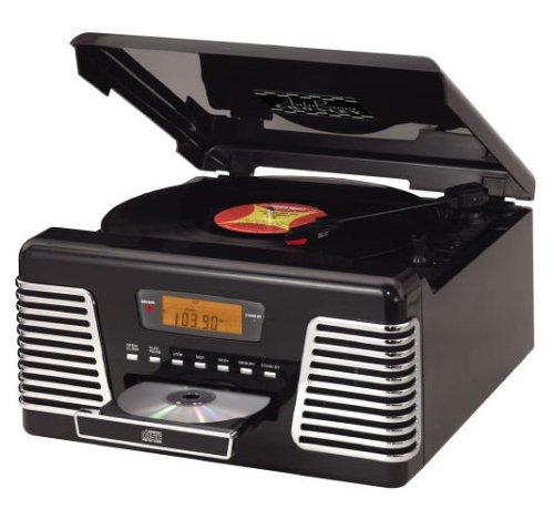 - Plays 33-1/3, 45, and 78 rpm records; analog AM/FM radio with external FM antenna