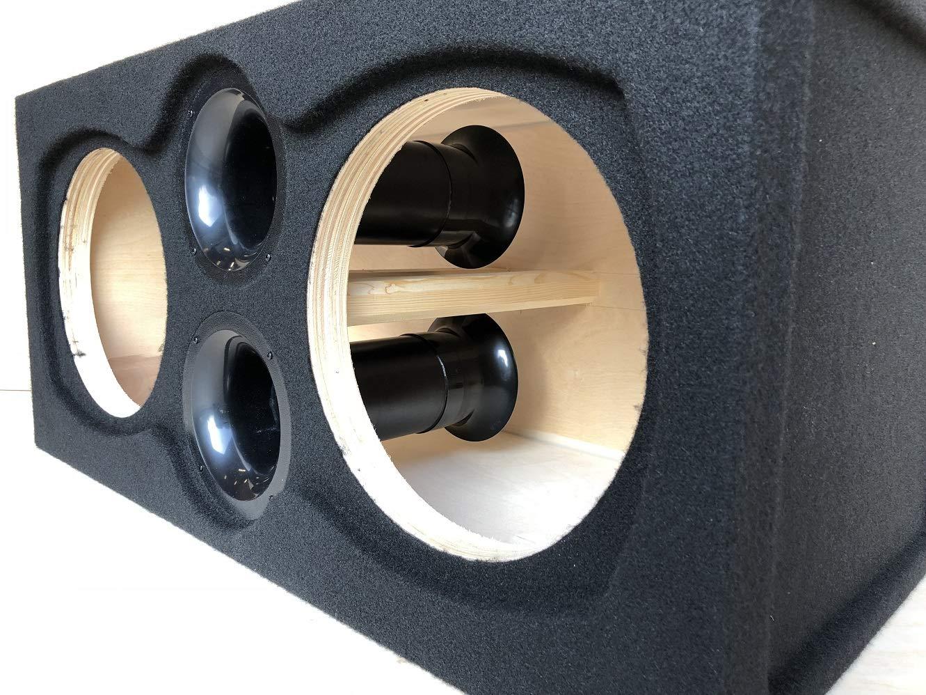 Custom ported subwoofer enclosure for 2 12" Orion HCCA Subwoofers---- We use 4" aeroports (flared ends) which allows air to flow in and out of the enclosure smoother than any other type of ported enclosure cutting back on port noise so you get nothing but clean, clear bass from from your subs - sealed with liquid nails caulk - all joints are glue and screwed together - black carpet